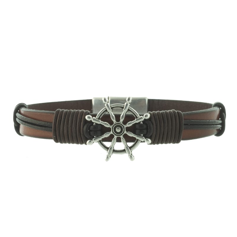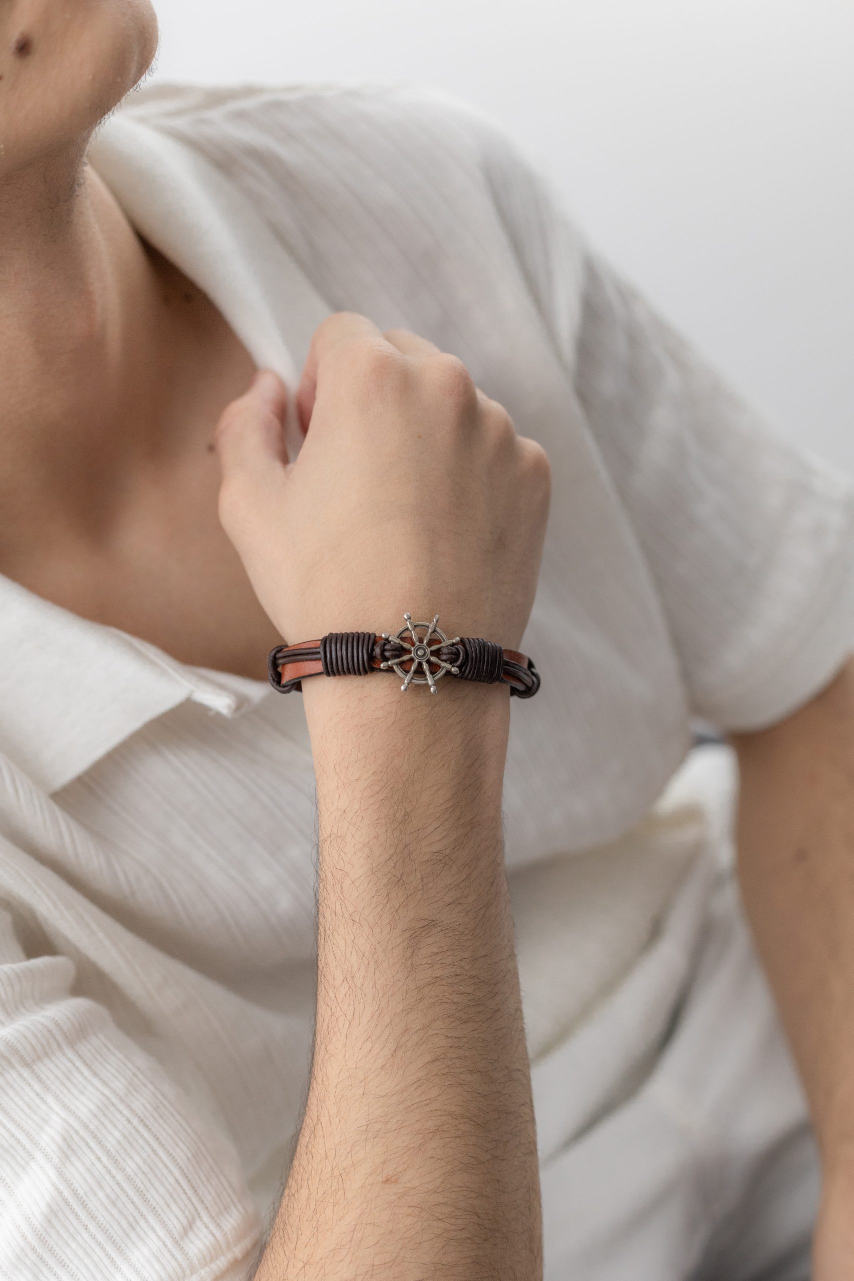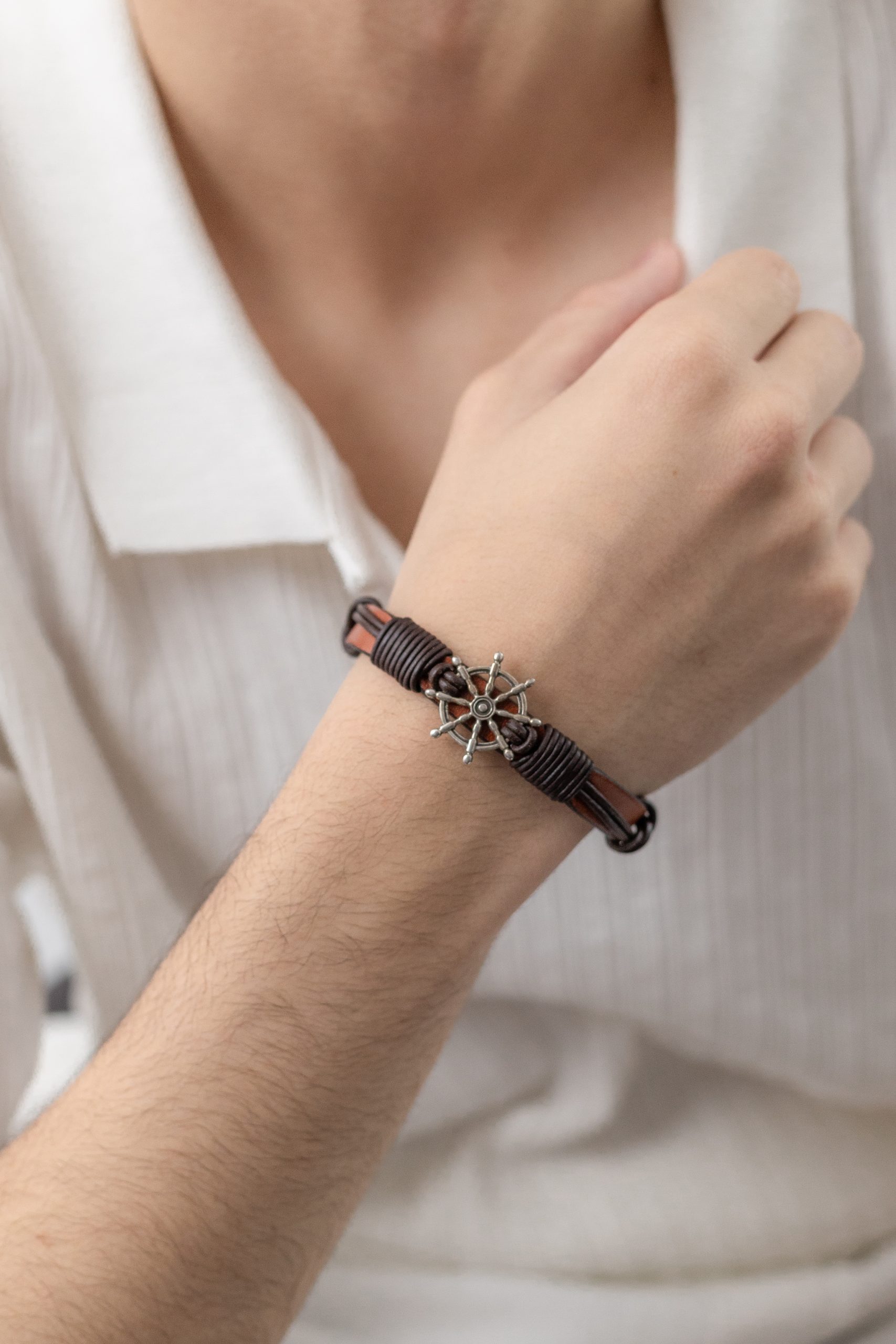Brățară bărbați ‘Anchor’ din piele maro cu împletitură și pandant placat cu argint