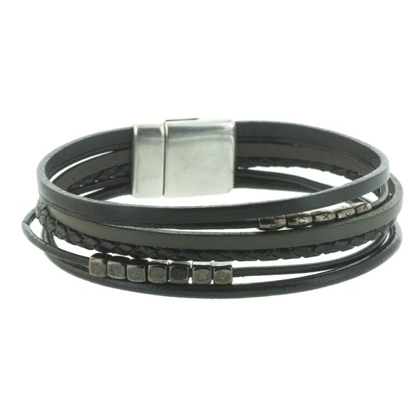 Brățară bărbați ‘Six’ neagră din 6 rânduri de piele și mărgele placate cu argint