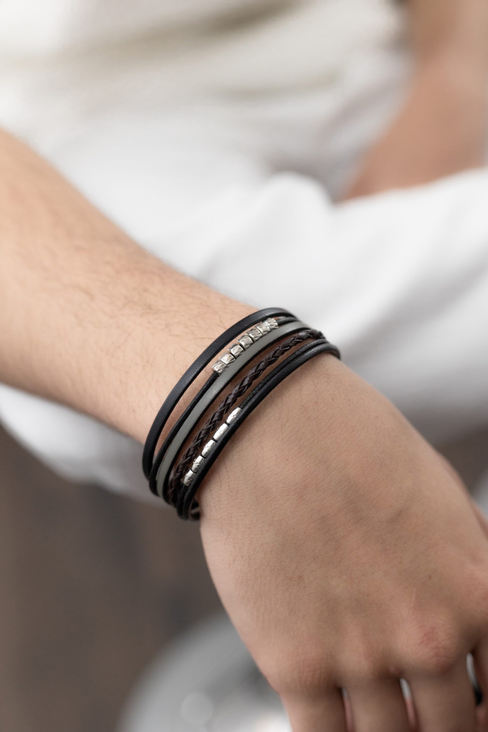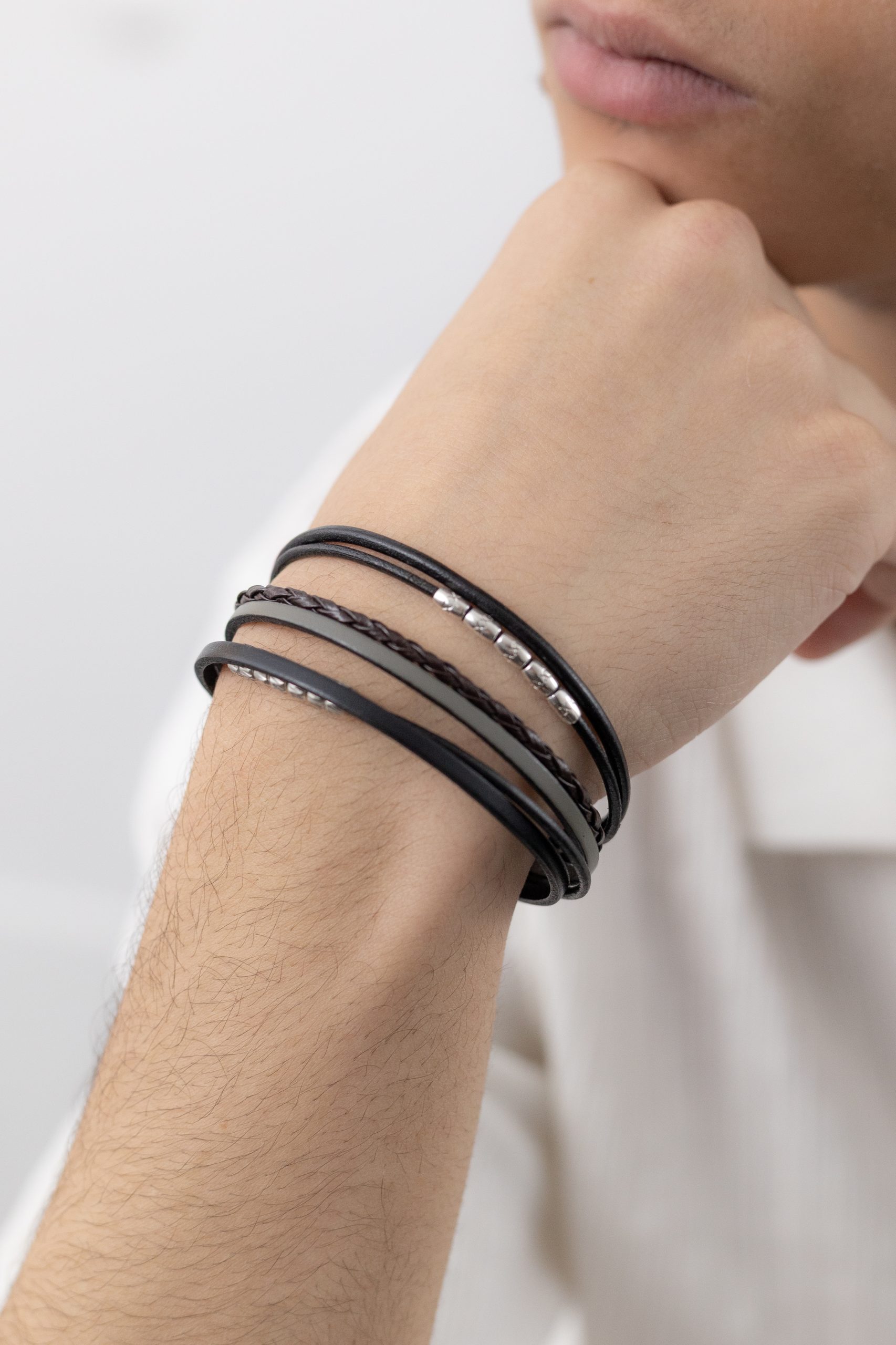Brățară bărbați ‘Six’ neagră din 6 rânduri de piele și mărgele placate cu argint
