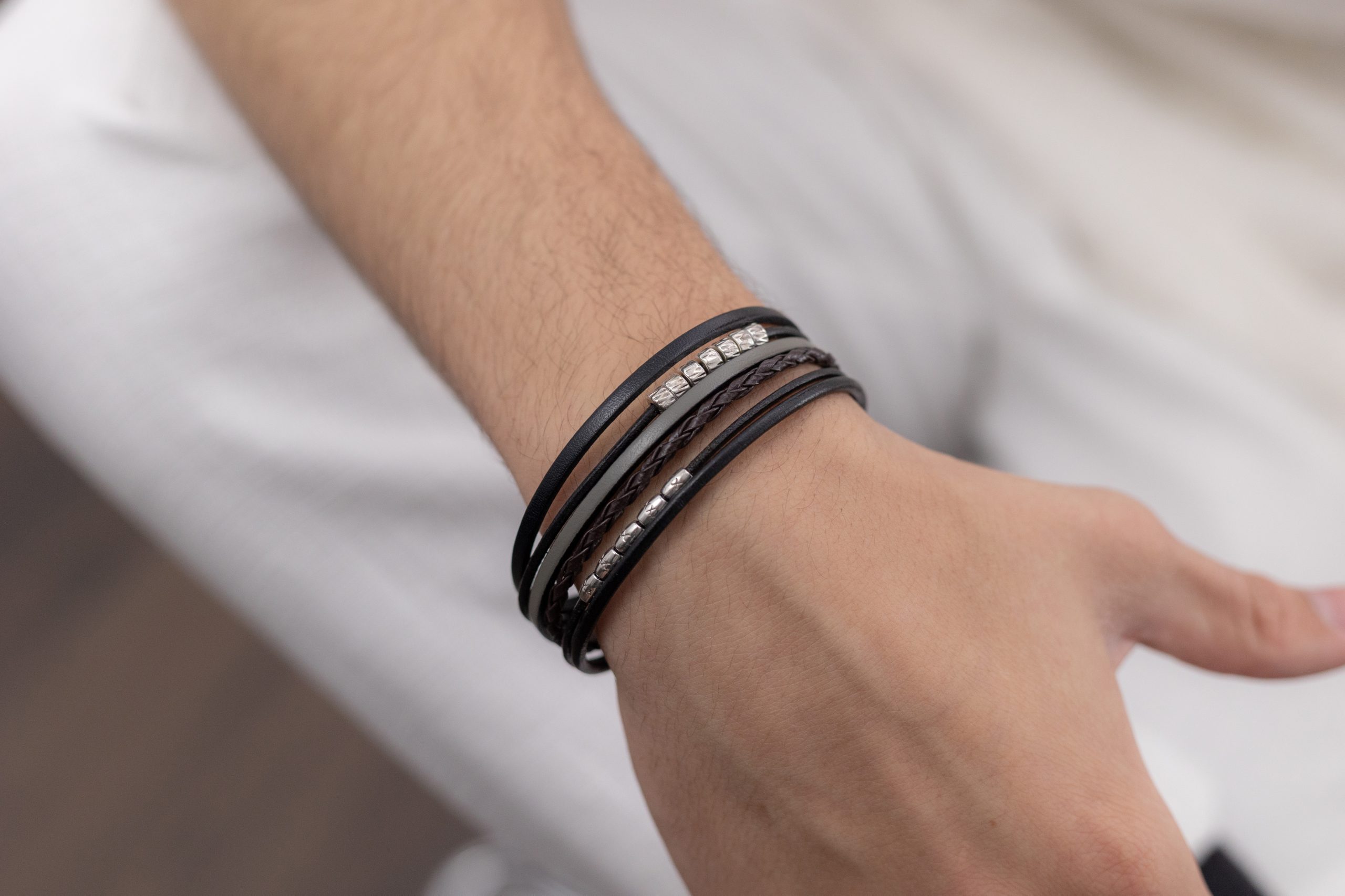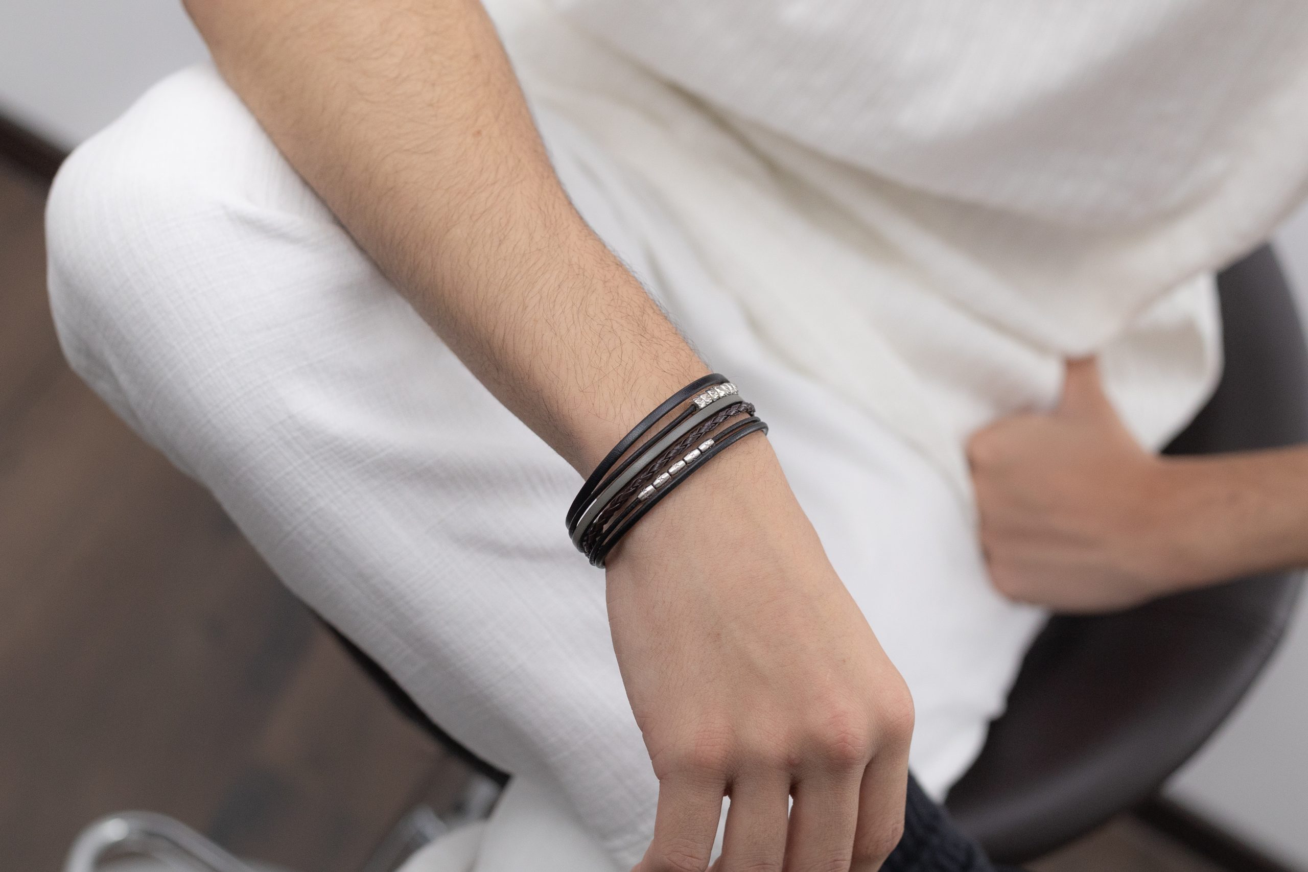 Brățară pentru bărbați realizată din 6 rânduri de piele naturală rotundă și împletită, decorată cu elemente placate cu argint. Dispune de un sistem de închidere magnetică placat cu argint. Mărimea brățării este S, M, L, XL și are o circumferință de 20, 21, 22, 23 cm. Această brățară este hipoalergenică. Piesele metalice sunt fabricate din ZAMAC (Zinc Aluminiu și Cupru) sau ALAMĂ (Fără nichel). Toate produsele noastre care intră în contact cu pielea sunt conforme cu Regulamentul european privind conținutul de nichel, cadmiu și plumb. Produs manual în Grecia! Referința: B9522S