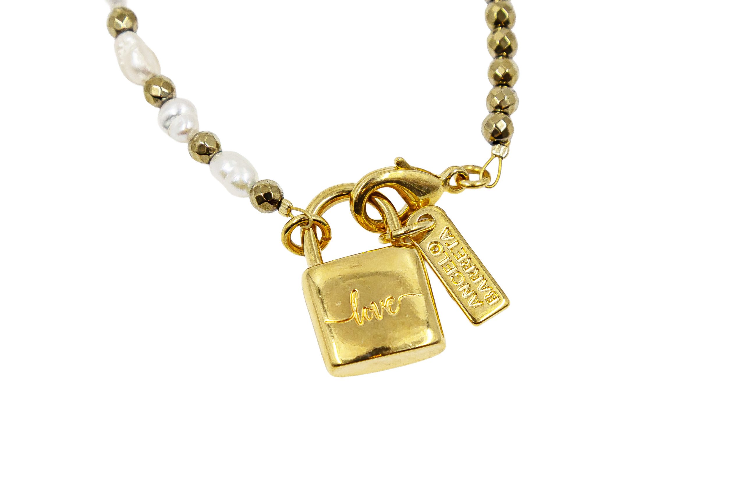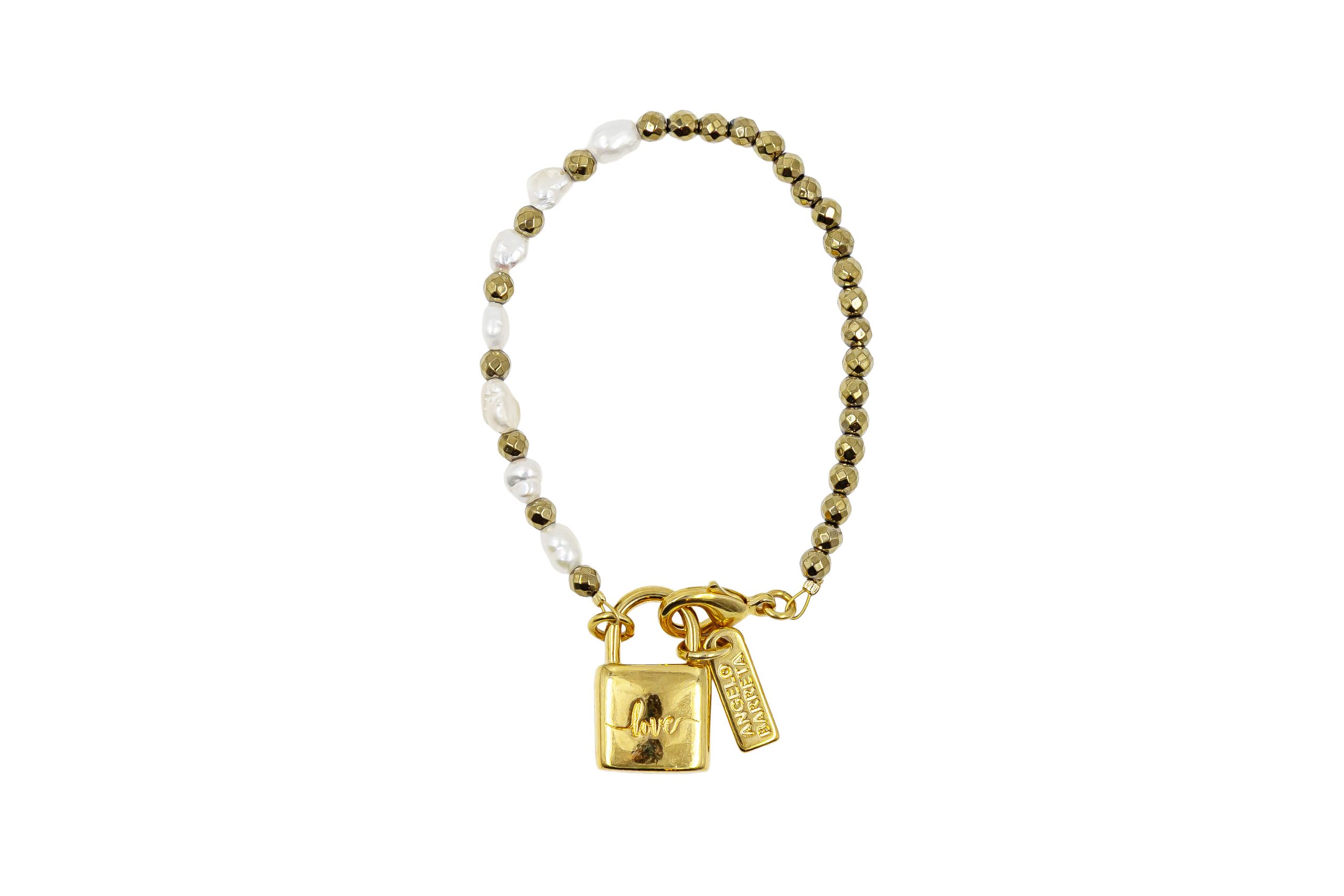 Brățară pentru femei realizată din mărgele placate cu aur de 24k, decorată cu perle de apă dulce, pandantiv lacăt și cu un sistem de închidere tip homar, cu extensie. Lungimea brățării este reglabilă și variază între 18 cm – 22 cm, extensia fiind de 4 cm. Această brățară este hipoalergenică. Piesele metalice sunt fabricate din ZAMAC (Zinc, Aluminiu și Cupru) sau ALAMĂ (Fără nichel). Toate produsele noastre care intră în contact cu pielea sunt conforme cu Regulamentul european privind conținutul de nichel, cadmiu și plumb. Produs manual în Grecia! Referința: Placat cu aur. Bratara de margele cu perle de apa dulce si pandantiv placat cu cheie Gold plated. beads bracelet with fresh water pearls and gold plated key lock pendant B5224G