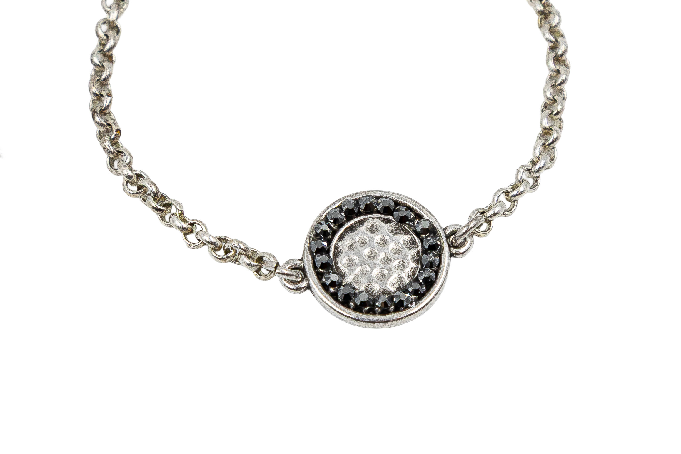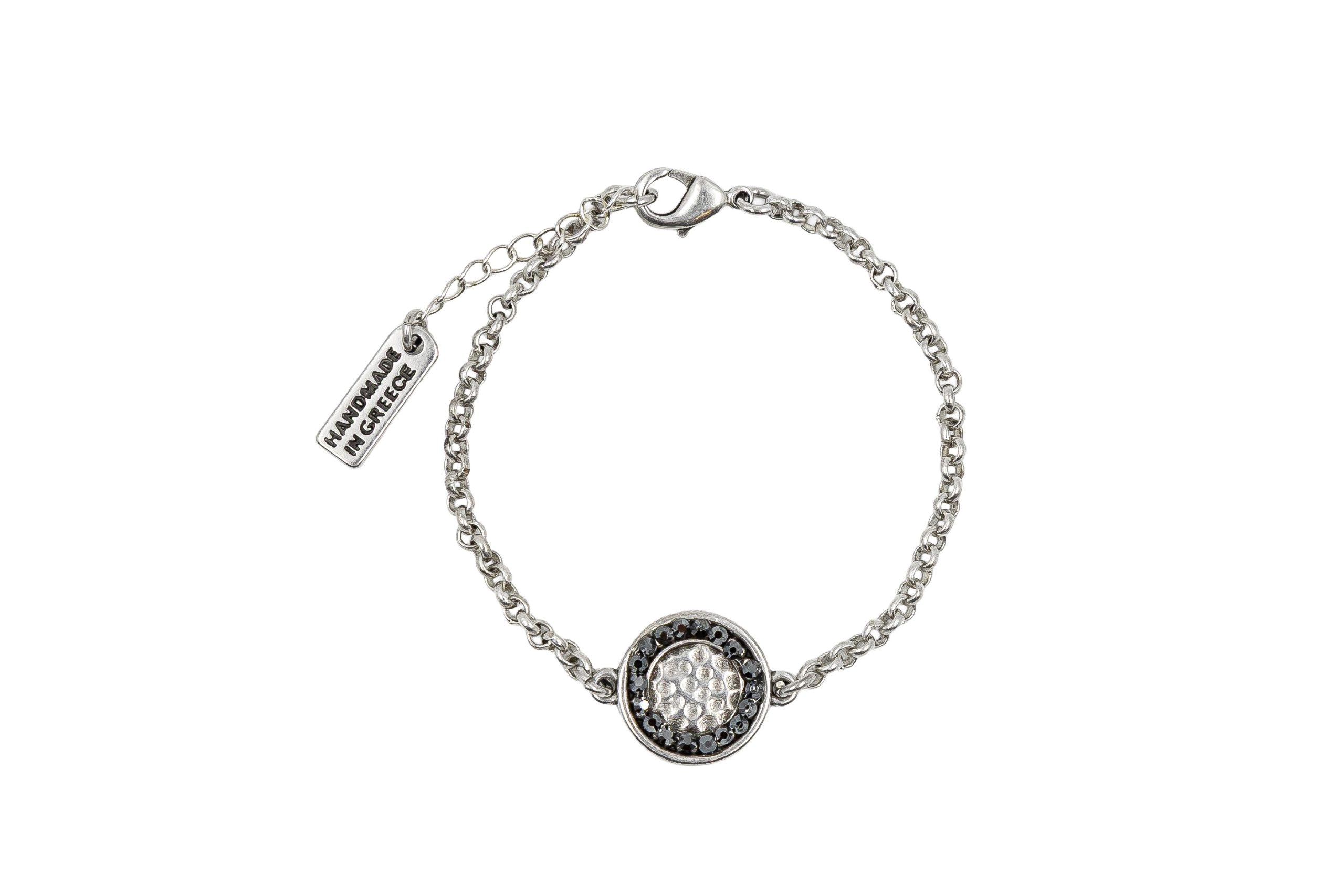 Brățară pentru femei realizată din lanț de zamac placat cu argint, decorată cu cristale. Dispune de lanț extensibil placat cu argint și închidere tip homar. Lungimea brățării este reglabilă și variază între 18 cm – 22 cm, extensia fiind de 4 cm. Această brățară este hipoalergenică. Toate piesele metalice sunt fabricate din ZAMAC (zinc, aluminiu și cupru) sau alamă (fără nichel). Toate produsele noastre care intră în contact cu pielea sunt conforme cu Regulamentul European Reach privind conținutul de nichel, cadmiu și plumb. Produs manual în Grecia! Referința: B5554S