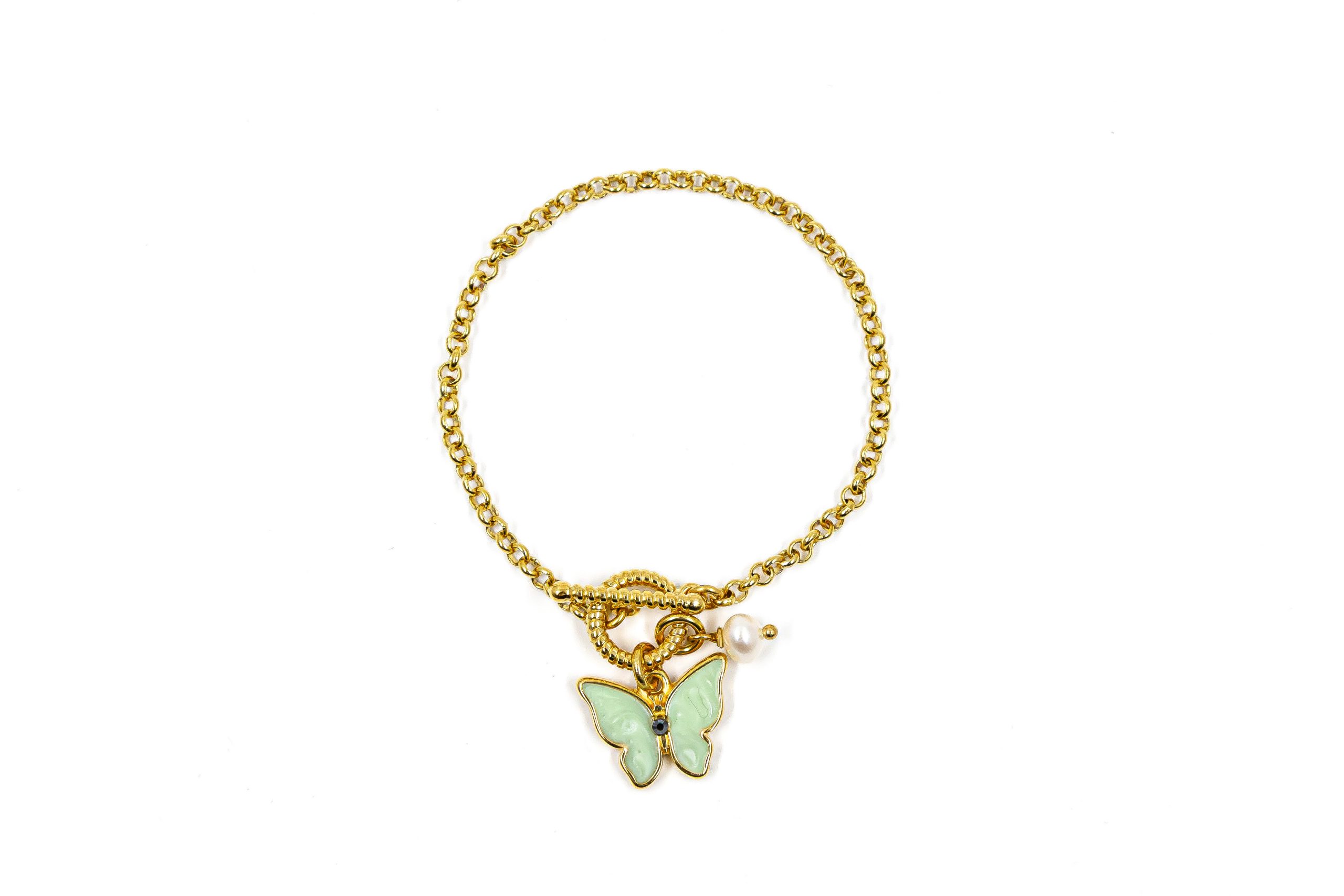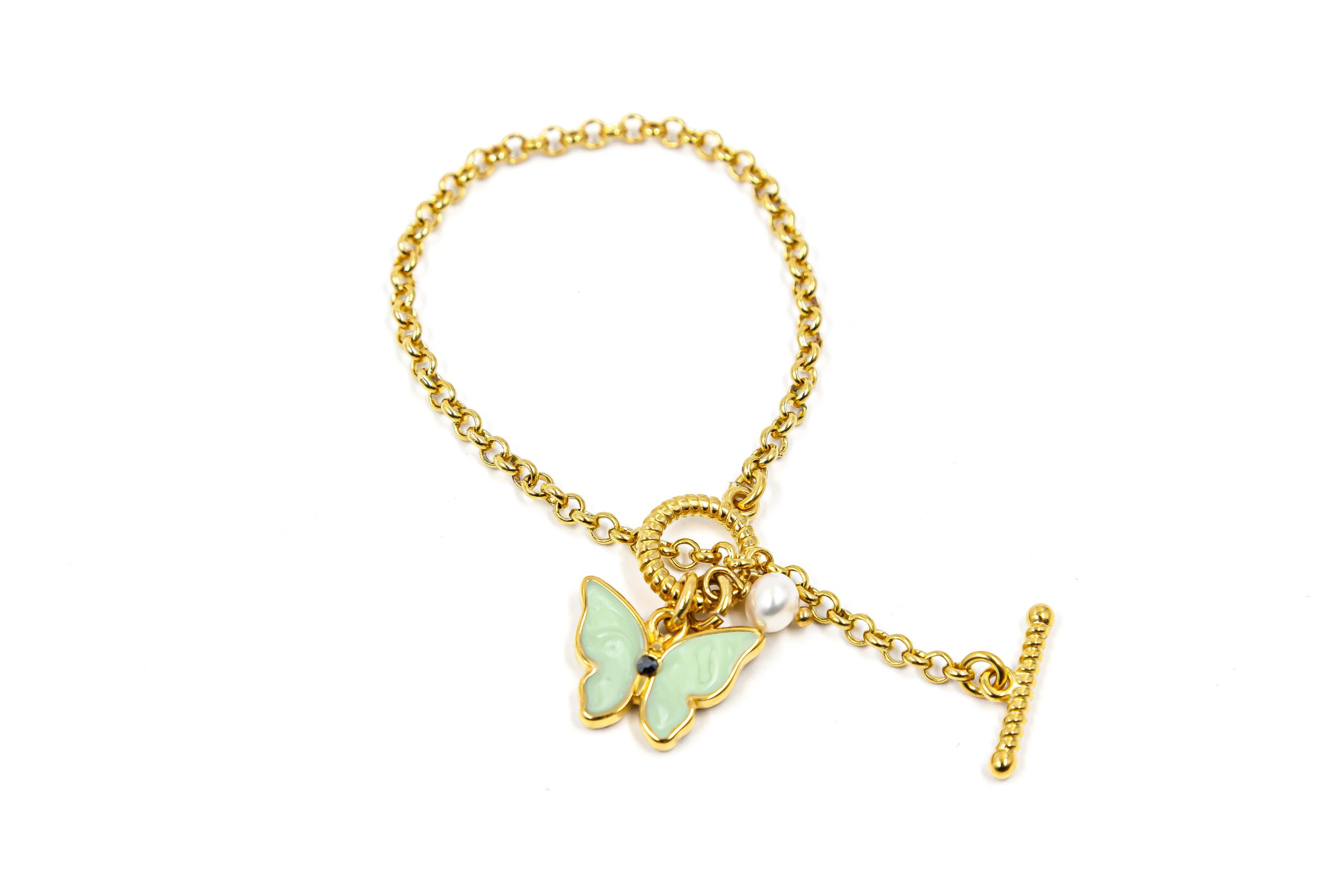 Brățară pentru femei realizată din lanț placat cu aur de 24k, decorată cu pandantiv din fluturi din email decorați cu strasuri și perlă naturală de cultură de apă dulce, și închidere frontală tip cerc. Lungimea brățării este reglabilă și variază între 17 cm – 18 cm, extensia fiind de 1 cm. Această brățară este hipoalergenică. Toate piesele metalice sunt fabricate din ZAMAC (zinc, aluminiu și cupru) sau alamă (fără nichel). Toate produsele noastre care intră în contact cu pielea sunt conforme cu Regulamentul European Reach privind conținutul de nichel, cadmiu și plumb. Produs manual în Grecia! Referința: B6116G