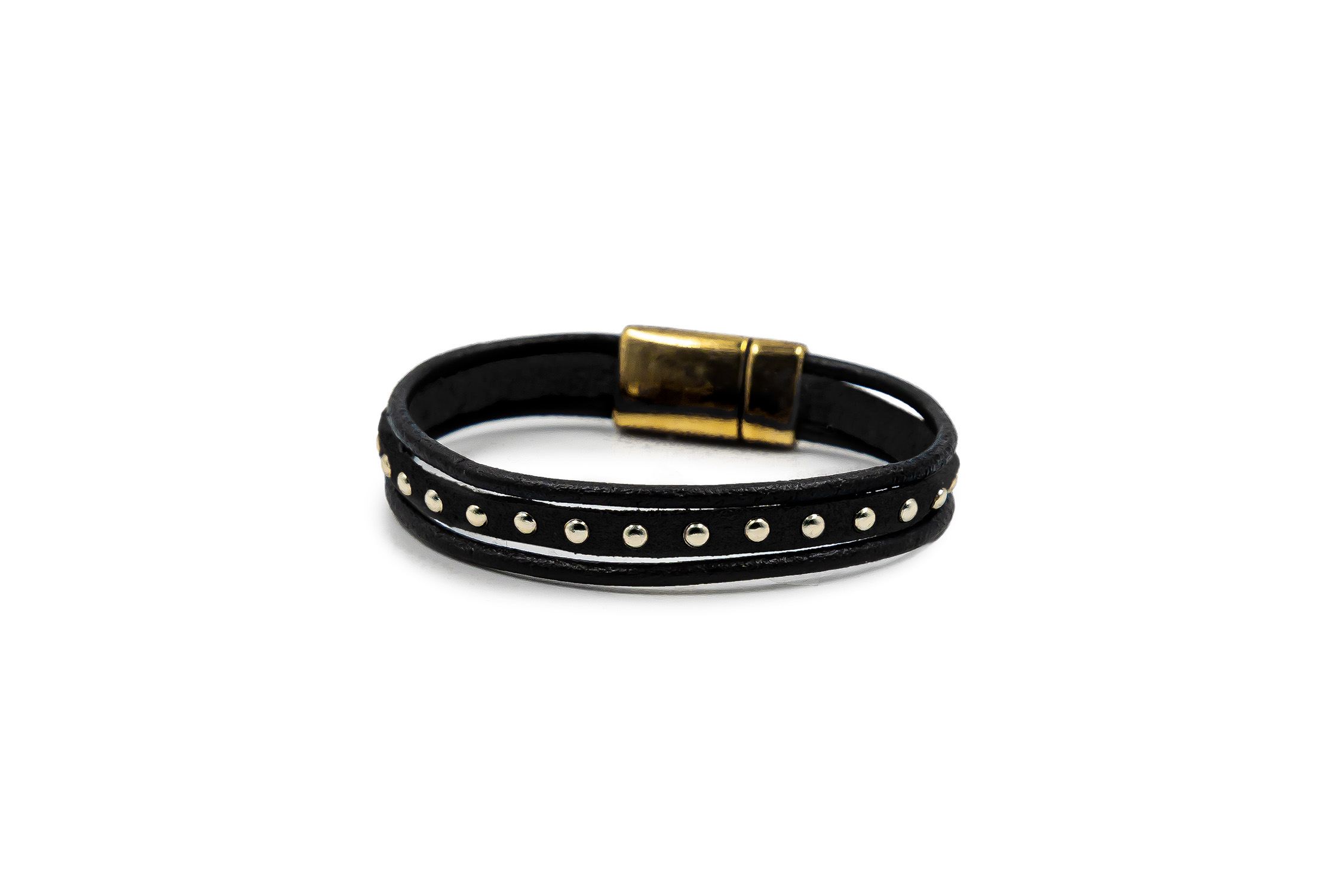 Brățară pentru femei realizată din 3 rânduri de piele și piele întoarsă decorată cu elemente placate cu aur de 24k și cu un sistem de închidere magnetică placat cu aur de 24k. Circumferința brățării este de 19 cm. Această brățară este hipoalergenică. Piesele metalice sunt fabricate din ZAMAC (Zinc, Aluminiu și Cupru) sau ALAMĂ (Fără nichel). Toate produsele noastre care intră în contact cu pielea sunt conforme cu Regulamentul european privind conținutul de nichel, cadmiu și plumb. Produs manual în Grecia! Referința: B5006G