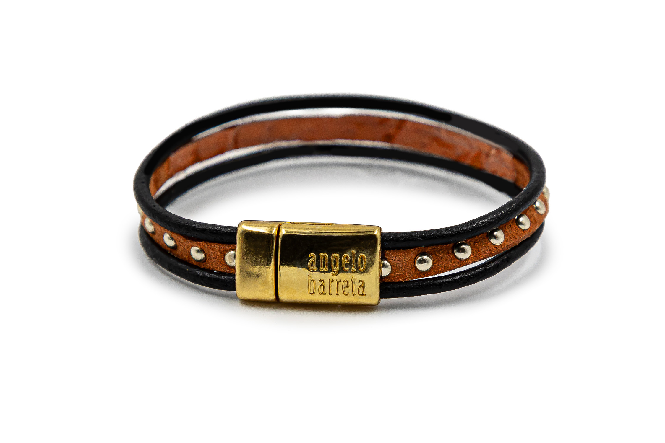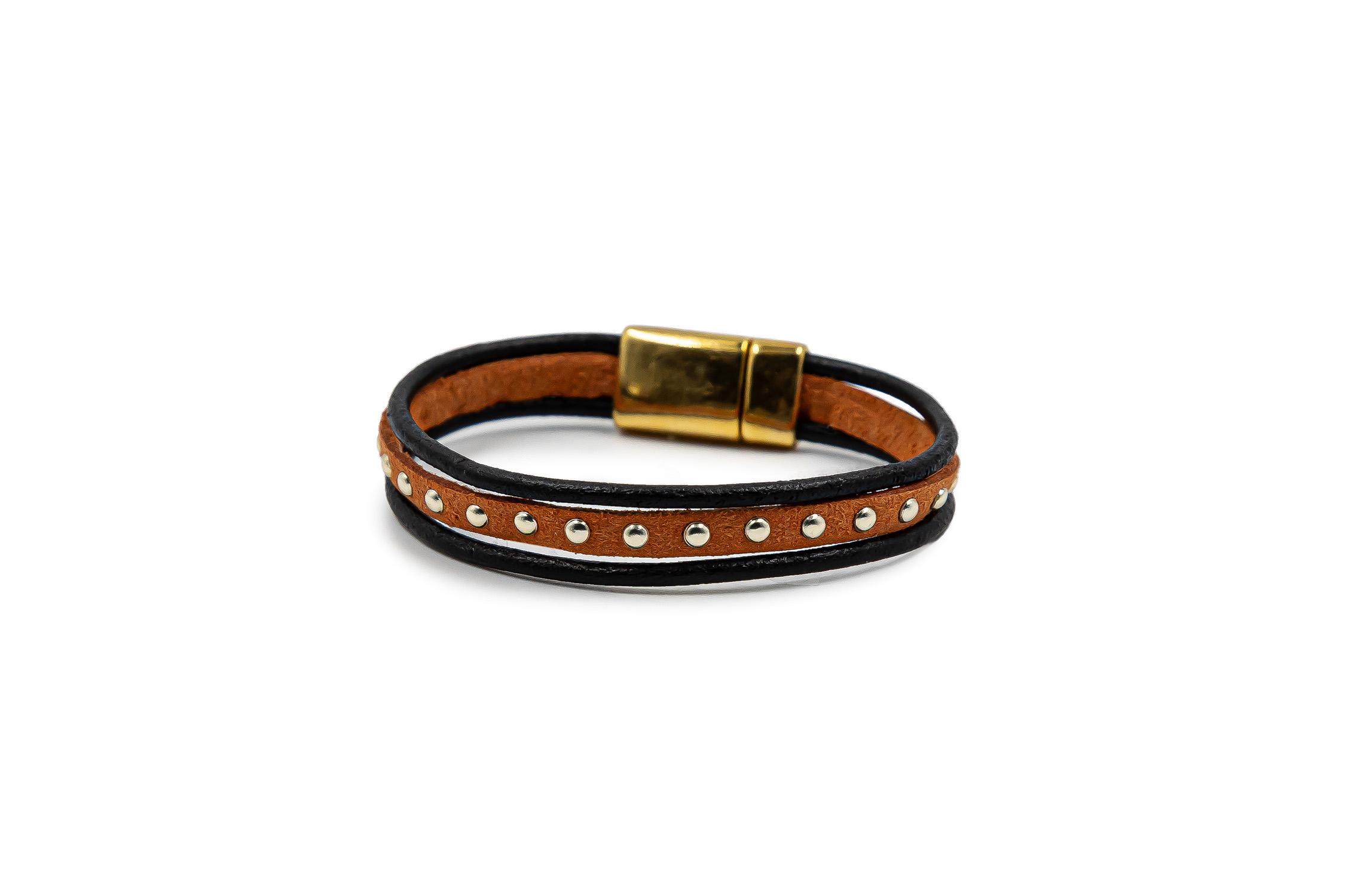 Brățară pentru femei realizată din 3 rânduri de piele și piele întoarsă decorată cu elemente placate cu aur de 24k și cu un sistem de închidere magnetică placat cu aur de 24k. Circumferința brățării este de 19 cm. Această brățară este hipoalergenică. Piesele metalice sunt fabricate din ZAMAC (Zinc, Aluminiu și Cupru) sau ALAMĂ (Fără nichel). Toate produsele noastre care intră în contact cu pielea sunt conforme cu Regulamentul european privind conținutul de nichel, cadmiu și plumb. Produs manual în Grecia! Referința: B5006G