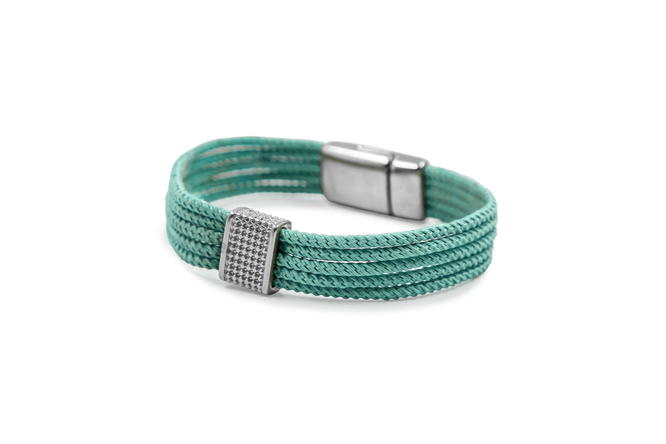 Brățară pentru femei realizată din 5 rânduri de șnur decorată cu elemente decorative placate cu argint și cu un sistem de închidere magnetică placat cu argint. Circumferința brățării este de 25 cm. Această brățară este hipoalergenică. Piesele metalice sunt fabricate din ZAMAC (Zinc, Aluminiu și Cupru) sau ALAMĂ (Fără nichel). Toate produsele noastre care intră în contact cu pielea sunt conforme cu Regulamentul european privind conținutul de nichel, cadmiu și plumb. Produs manual în Grecia! Referința: B5010S
