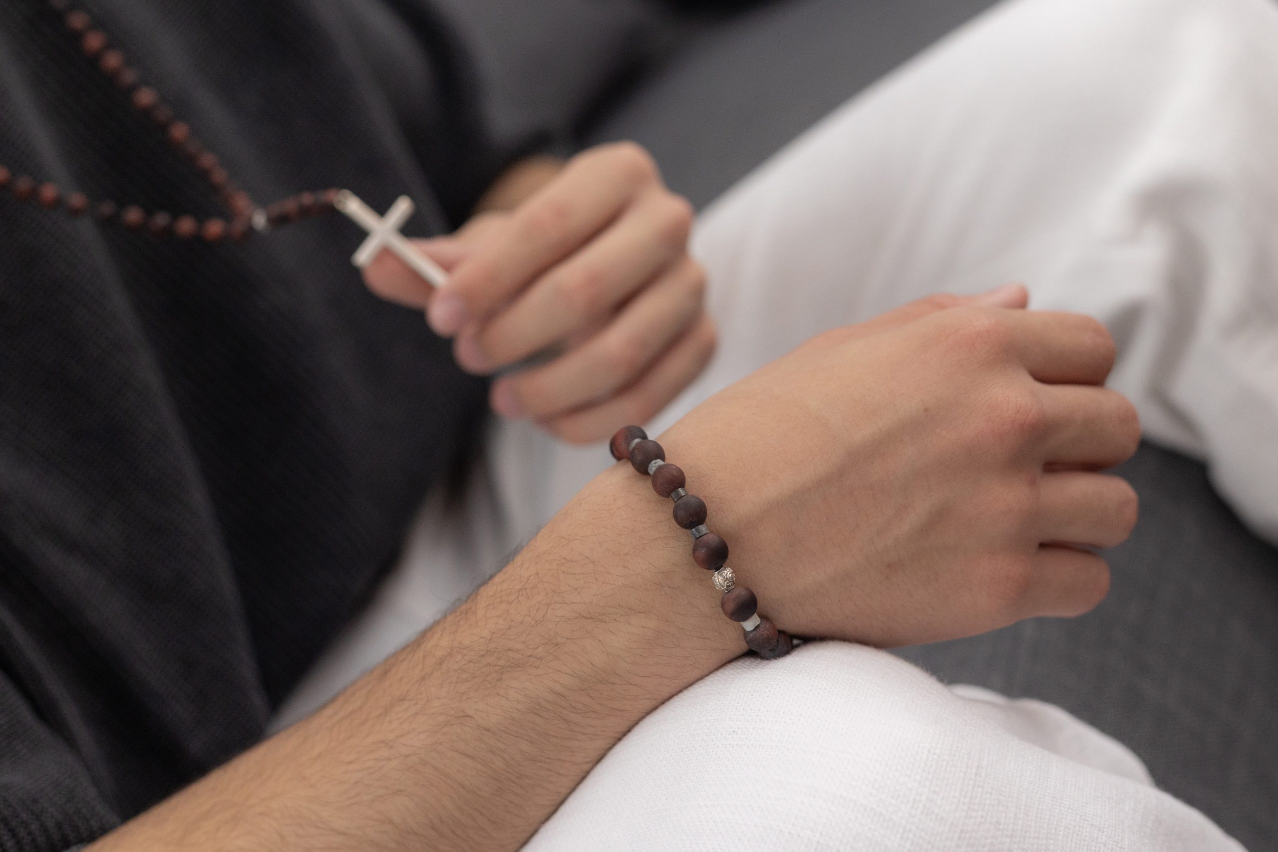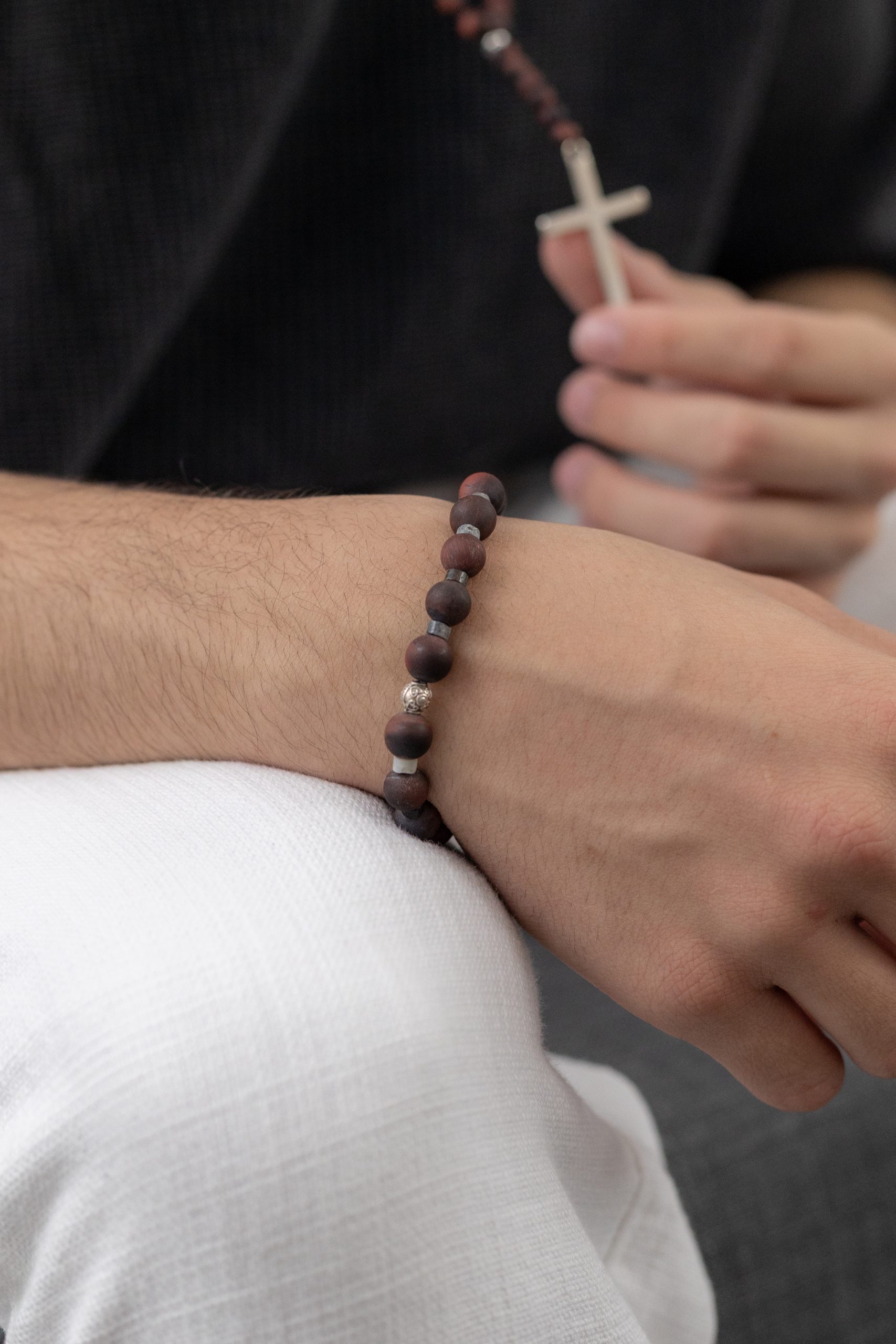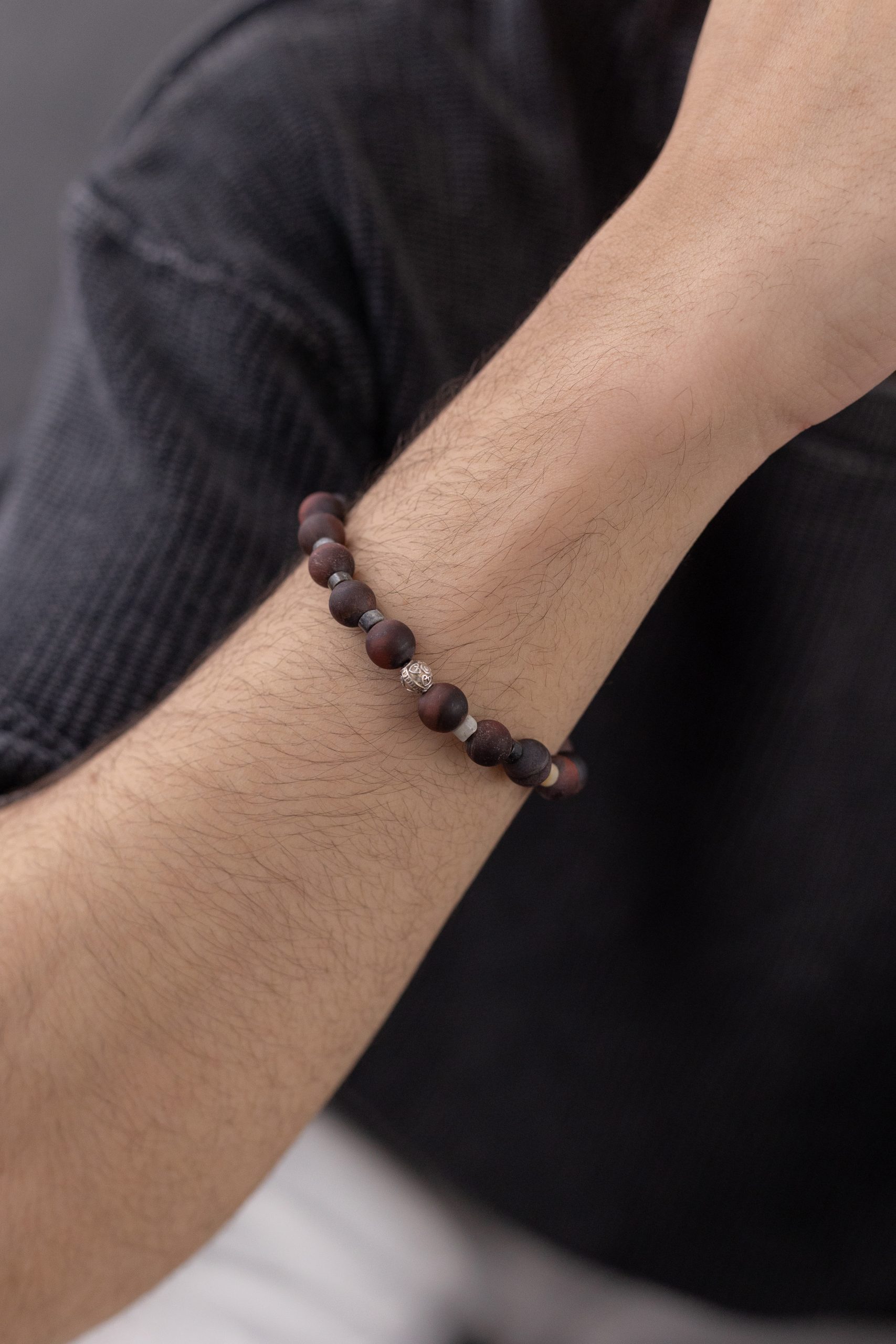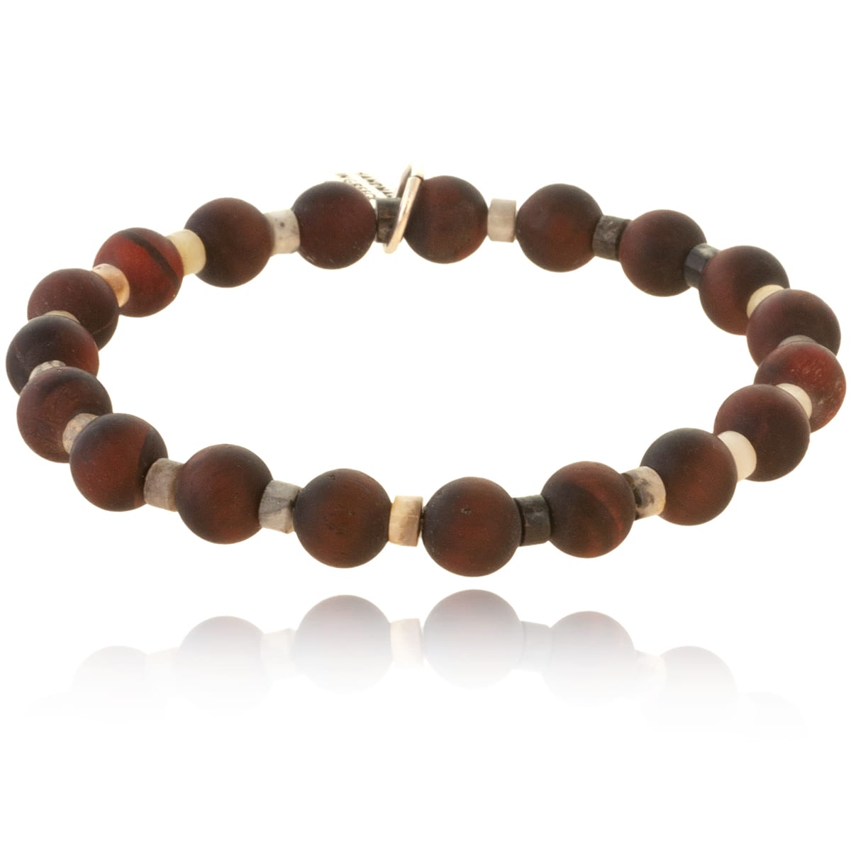 Brățară unisex realizată din pietre semiprețioase – Ochi de tigru roșu, decorată cu rondele de amazonite și elemente placate cu argint. Brățara este elastică, montată pe șnur din silicon, lungimea ei este reglabilă și variază între 21 cm – 22 cm, extensia fiind de 1 cm. Această brățară este hipoalergenică. Piesele metalice sunt fabricate din ZAMAC (Zinc Aluminiu și Cupru) sau ALAMĂ (Fără nichel). Toate produsele noastre care intră în contact cu pielea sunt conforme cu Regulamentul european privind conținutul de nichel, cadmiu și plumb. Produs manual în Grecia! Referința: B0735S
