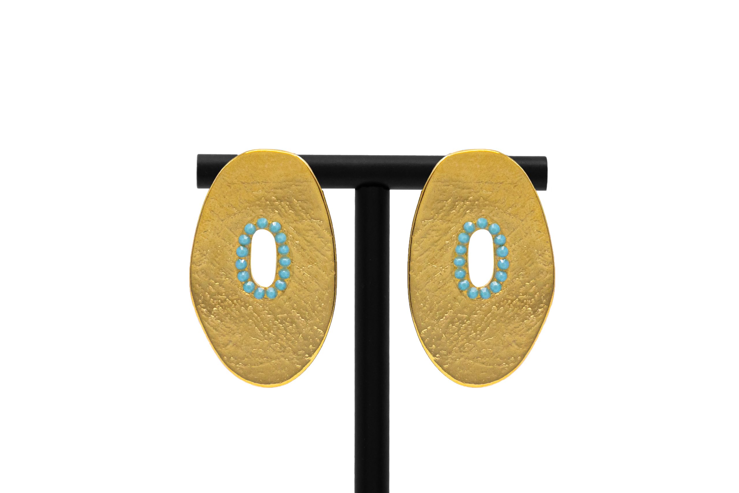 Cercei ovali pentru femei placați cu aur de 24k și decorați cu cristale. Sistemul de închidere este cu pin chirurgical din titan. Dimensiunea cerceilor este de 40 mm. Acești cercei sunt hipoalergenici, piesele metalice sunt fabricate din ZAMAC (Zinc Aluminiu și Cupru) sau ALAMĂ (Fără nichel). Toate produsele noastre care intră în contact cu pielea sunt conforme cu Regulamentul european privind conținutul de nichel, cadmiu și plumb. Produs manual în Grecia! Referinta: Ε21254 GOL TUR