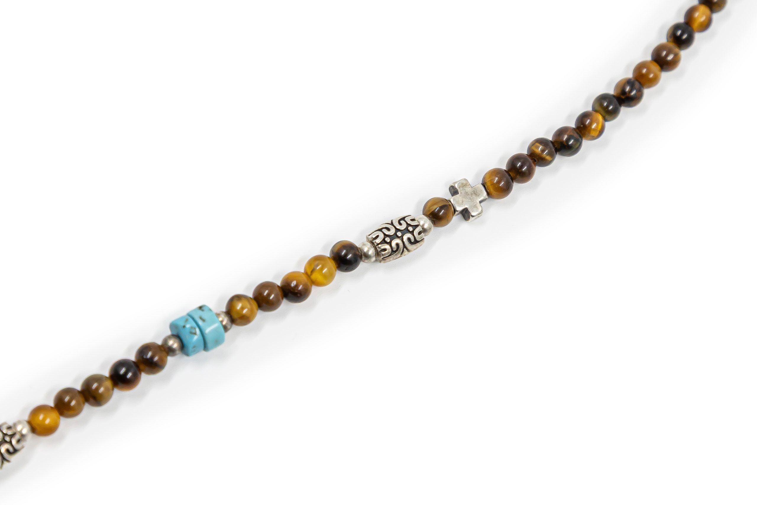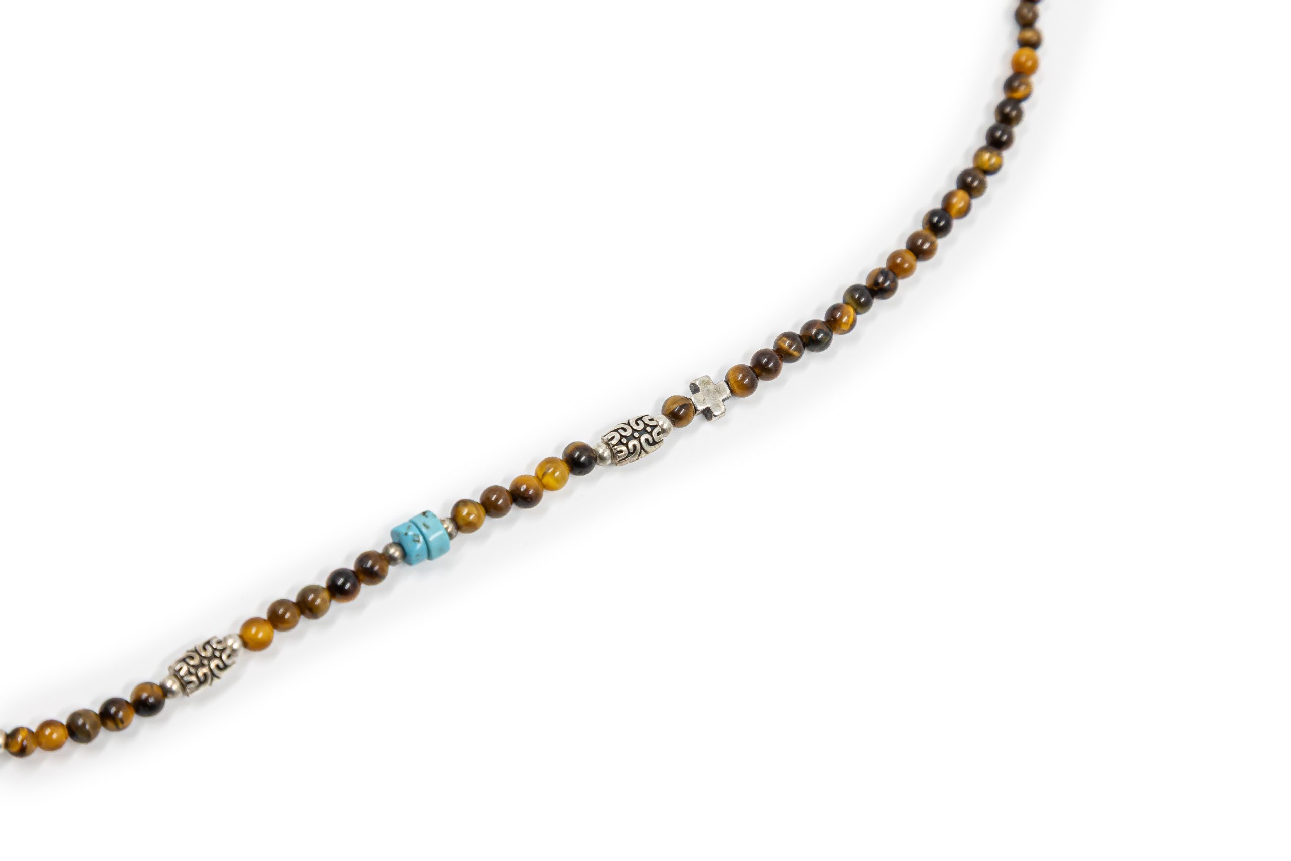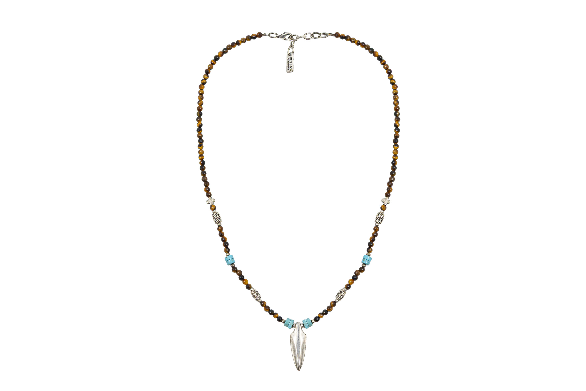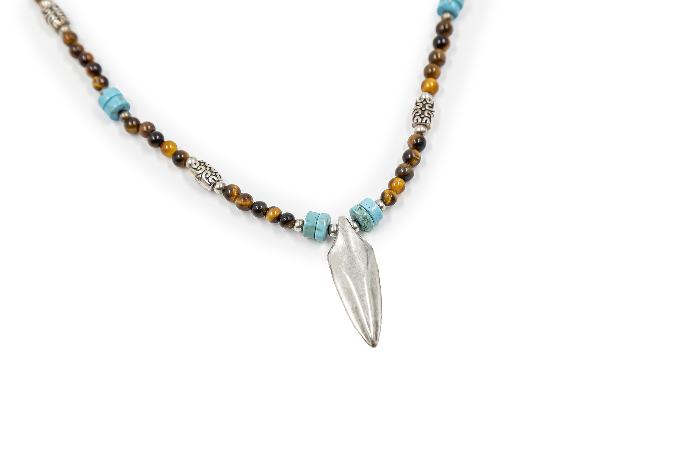 Colier pentru bărbați de dimensiune medie, realizat din pietre semiprețioase de agat, ochi de tigru, cu hematite, și decorat cu pandantiv tip suliță. Dispune de un sistem de închidere reglabil, tip homar, cu lanț și placate cu argint. Lungimea colierului este medie și variază între 59 cm – 63 cm, extensia fiind de 4 cm. Acest colier este hipoalergenic. Piesele metalice sunt fabricate din ZAMAC (Zinc Aluminiu și Cupru) sau ALAMĂ (Fără nichel). Toate produsele noastre care intră în contact cu pielea sunt conforme cu Regulamentul european privind conținutul de nichel, cadmiu și plumb. Produs manual în Grecia! Referința: Men’s necklace with hematite, tiger eye and agate stones. K01029S