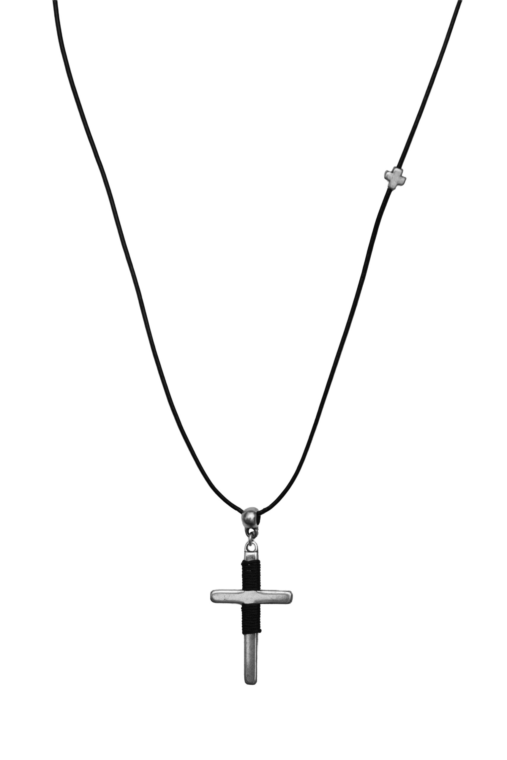 Colier pentru bărbați realizat dintr-un rând de șnur rotund din piele naturală de culoare neagră, decorat cu pandantiv tip cruce și elemente decorative placate cu argint. Dispune de un sistem de închidere reglabil, tip homar, cu lanț și placate cu argint. Lungimea colierului este reglabilă între 80 cm – 84 cm, extensia fiind de 4 cm. Acest colier este hipoalergenic. Piesele metalice sunt fabricate din ZAMAC (Zinc Aluminiu și Cupru) sau ALAMĂ (Fără nichel). Toate produsele noastre care intră în contact cu pielea sunt conforme cu Regulamentul european privind conținutul de nichel, cadmiu și plumb. Produs manual în Grecia! Referința: N0189S