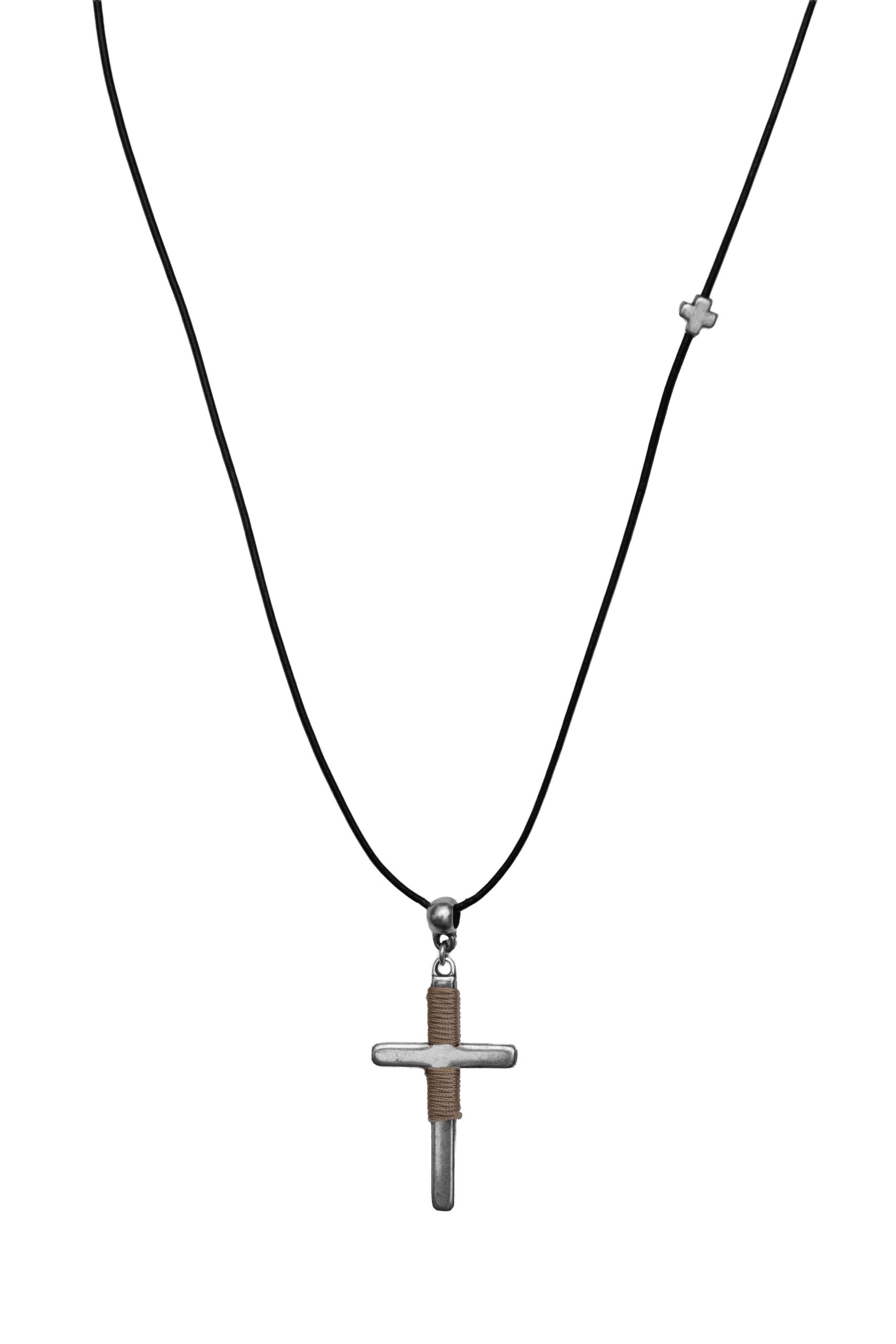 Colier pentru bărbați realizat dintr-un rând de șnur rotund din piele naturală de culoare neagră, decorat cu pandantiv tip cruce și elemente decorative placate cu argint. Dispune de un sistem de închidere reglabil, tip homar, cu lanț și placate cu argint. Lungimea colierului este reglabilă între 80 cm – 84 cm, extensia fiind de 4 cm. Acest colier este hipoalergenic. Piesele metalice sunt fabricate din ZAMAC (Zinc Aluminiu și Cupru) sau ALAMĂ (Fără nichel). Toate produsele noastre care intră în contact cu pielea sunt conforme cu Regulamentul european privind conținutul de nichel, cadmiu și plumb. Produs manual în Grecia! Referința: N0189S