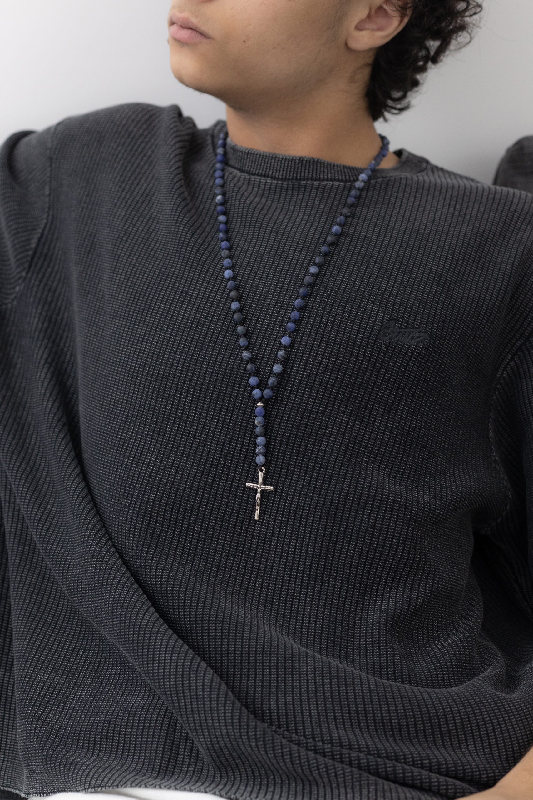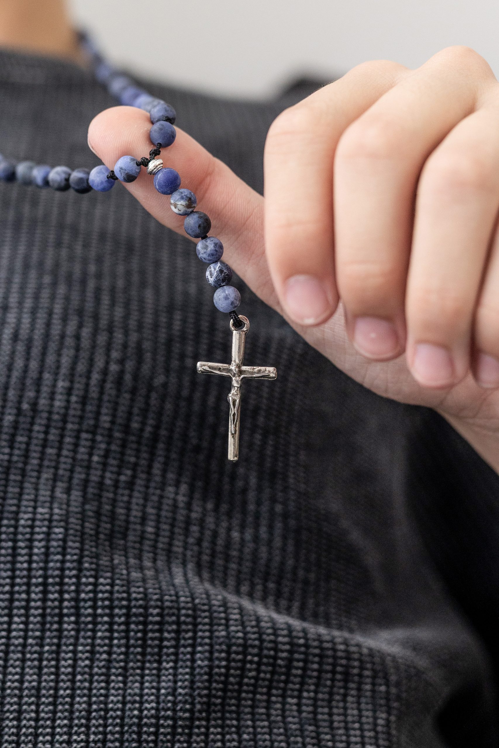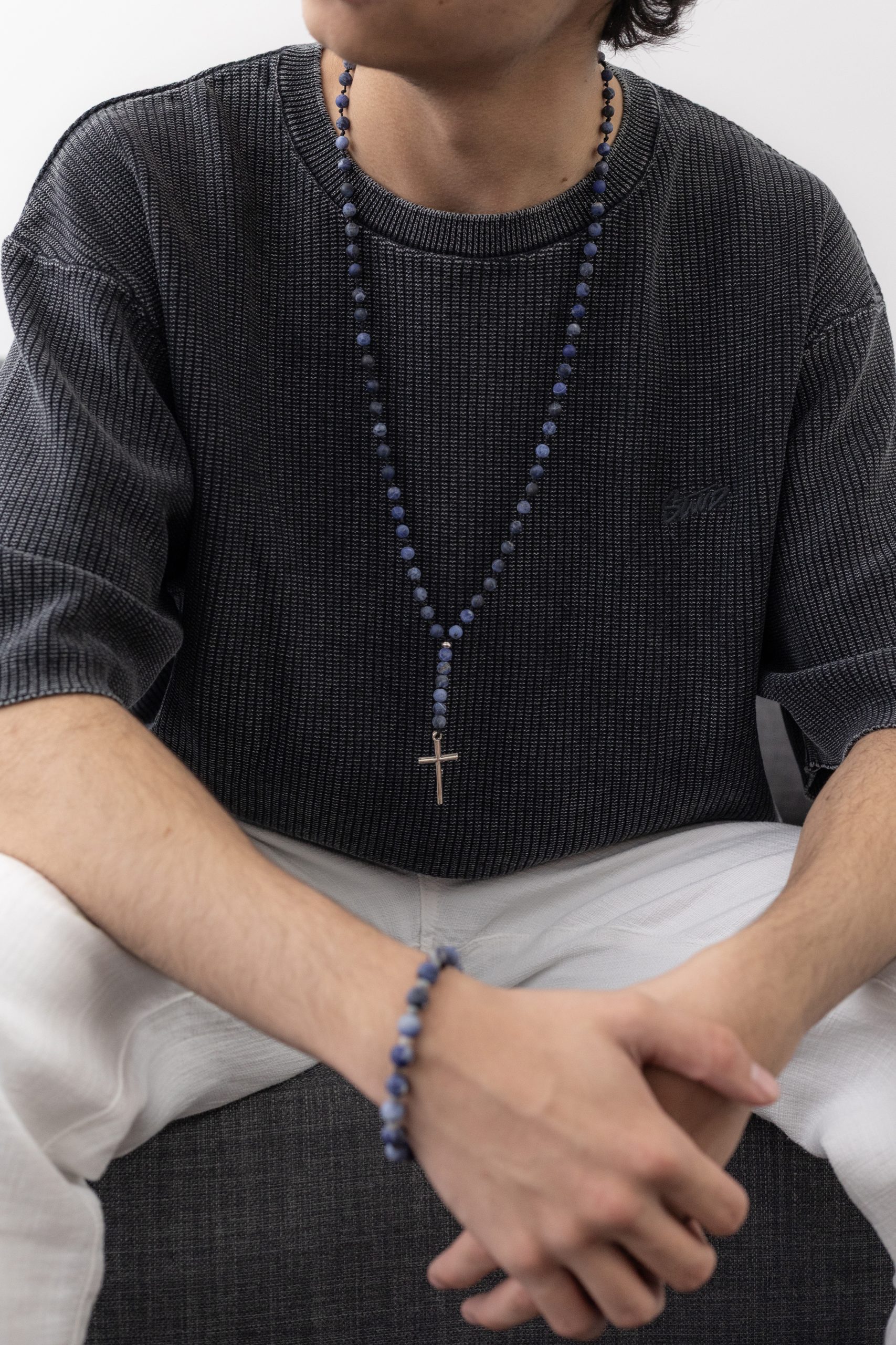 Colier bărbați ‘Rosariu’ albastru cu Sodalite și pandantiv cruce