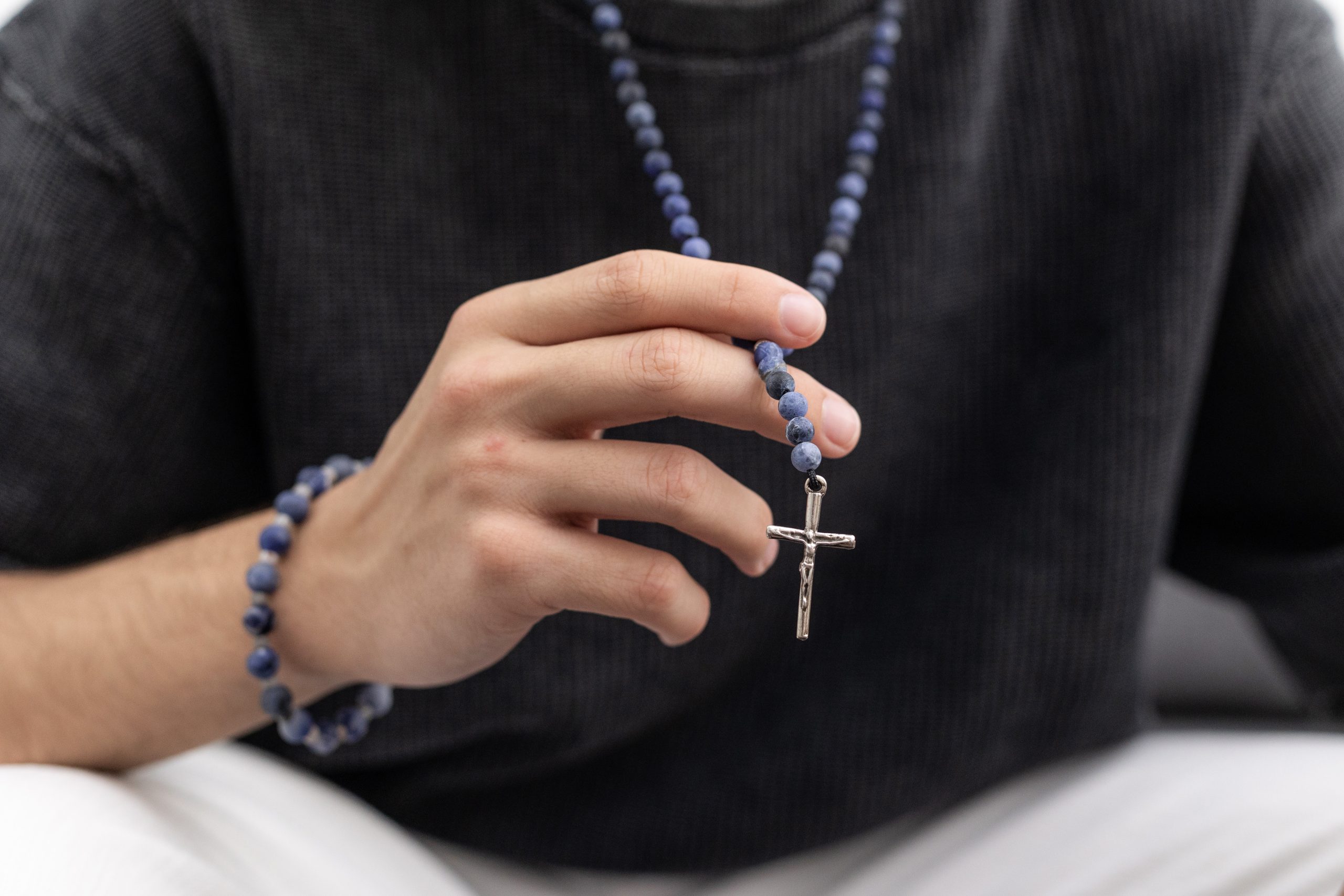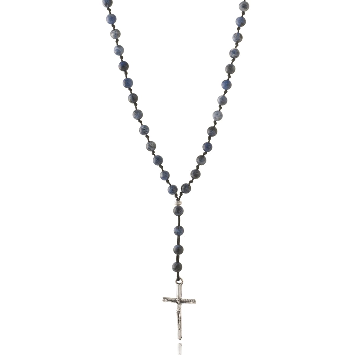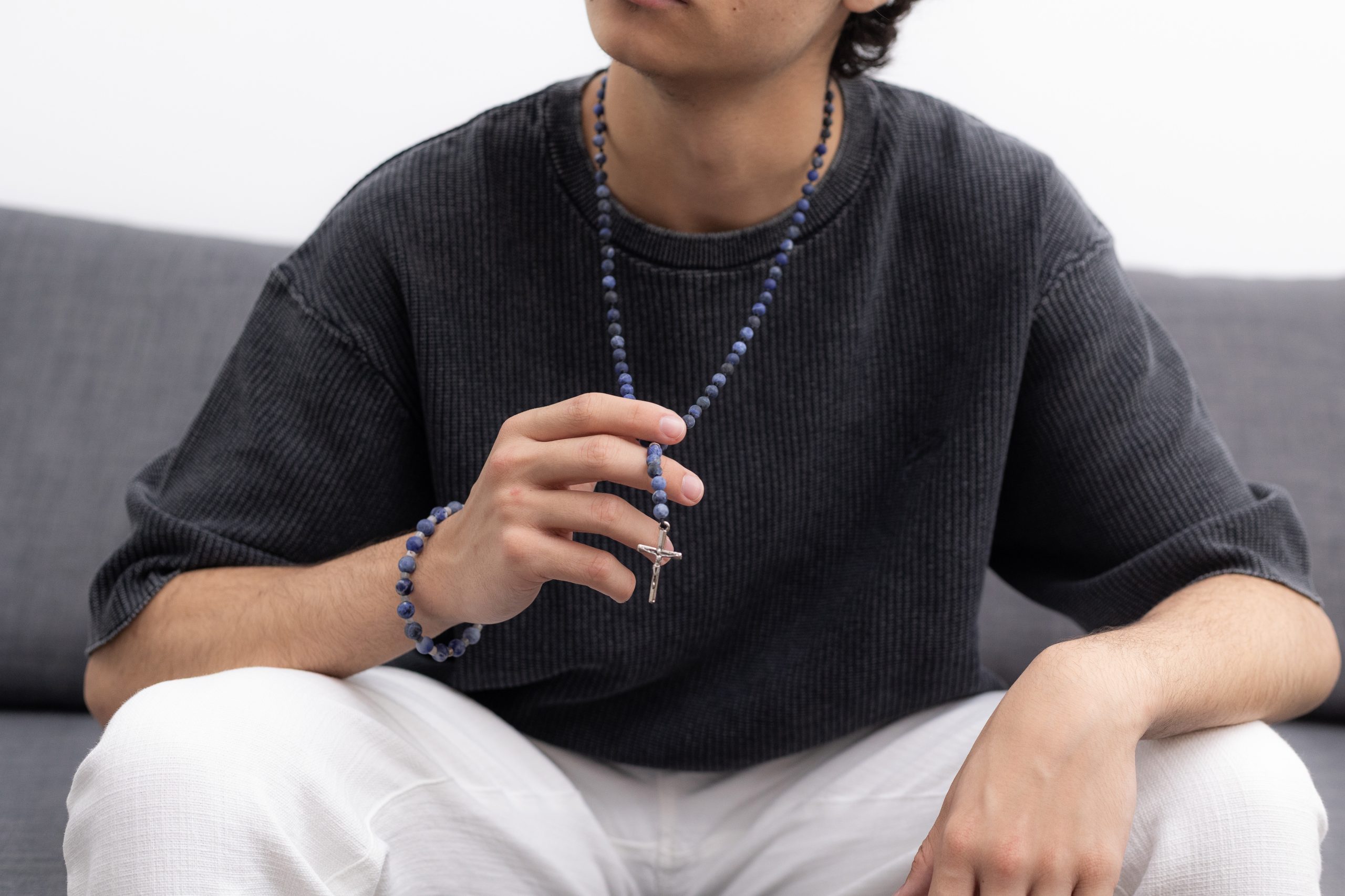 Colier bărbați ‘Rosariu’ albastru cu Sodalite și pandantiv cruce
