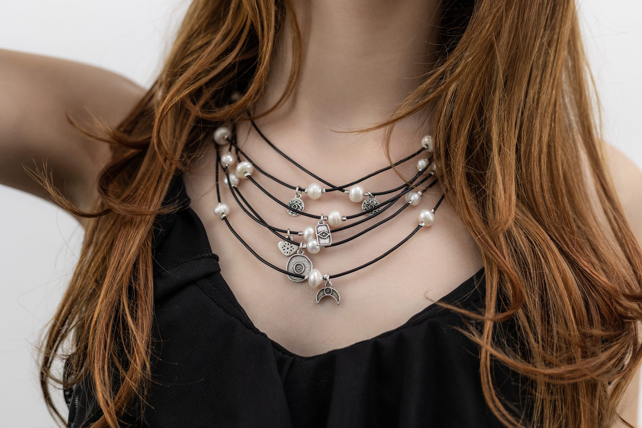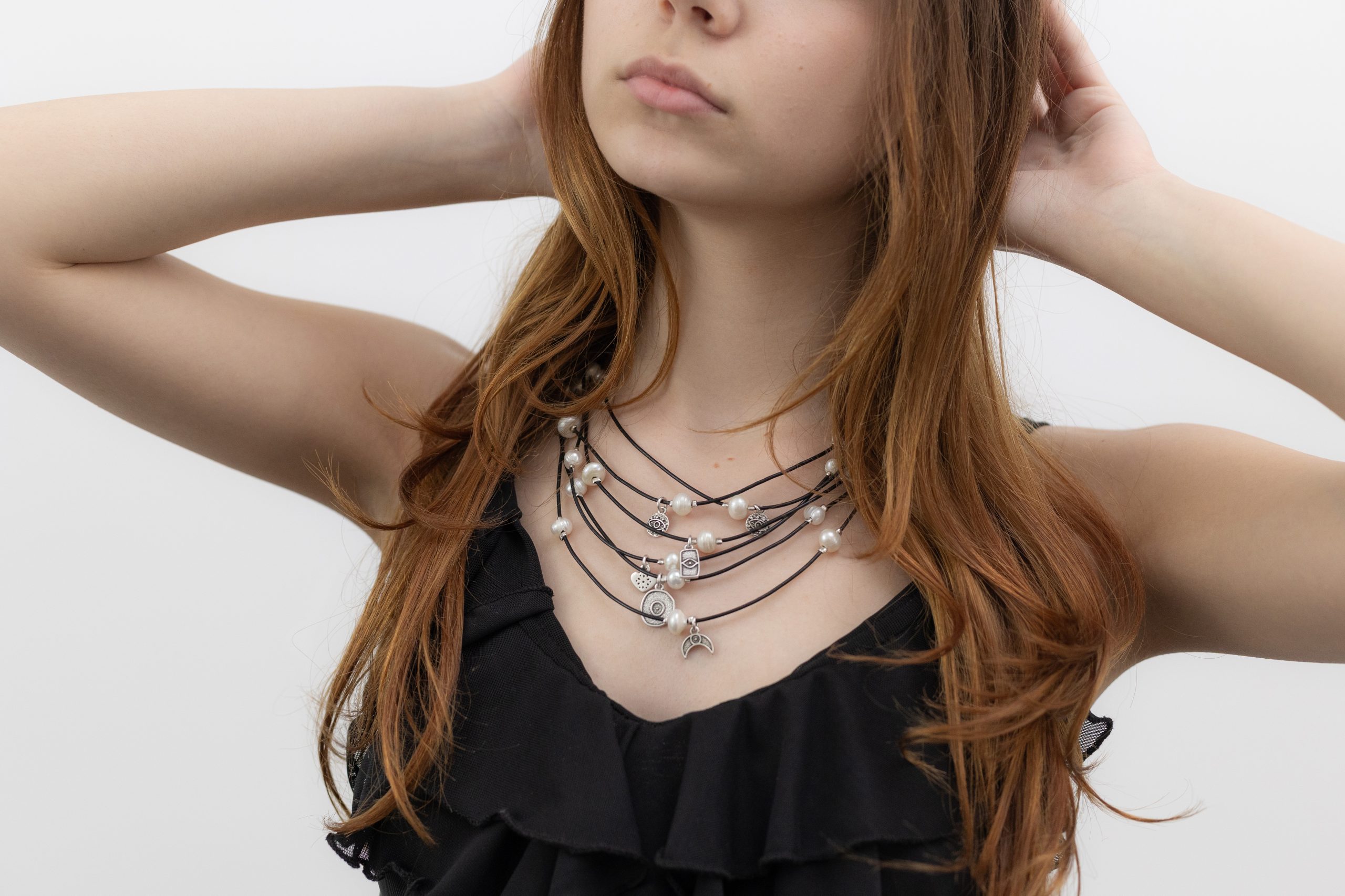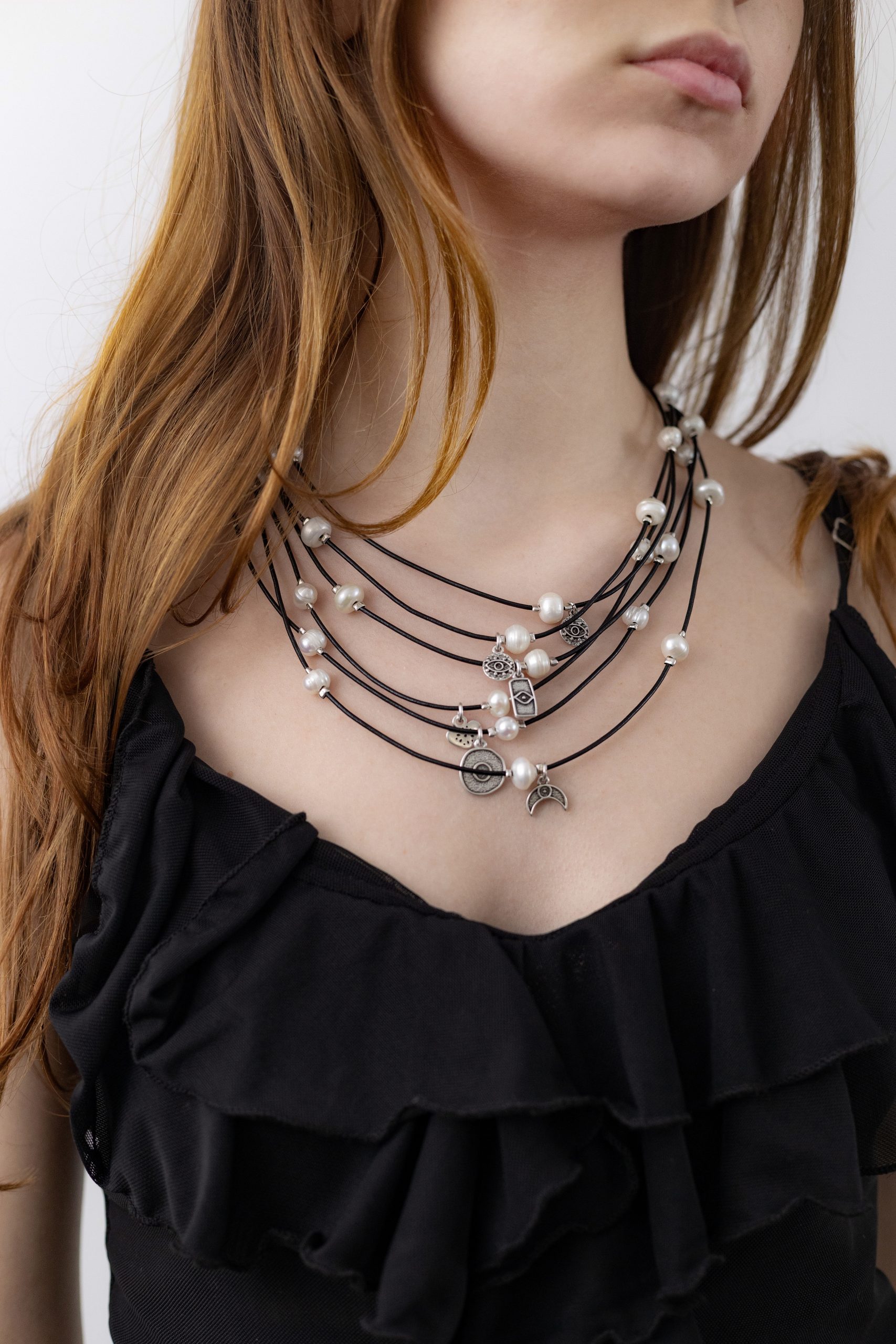 Colier pentru femei realizat din rânduri de șnur decorat cu pandantive cu perle de apă dulce, elemente decorative placate cu argint și cu un sistem de închidere magnetică. Lungimea colierului este de 26 cm. Acest colier este hipoalergenic. Piesele metalice sunt fabricate din ZAMAC (Zinc Aluminiu și Cupru) sau ALAMĂ (Fără nichel). Toate produsele noastre care intră în contact cu pielea sunt conforme cu Regulamentul european privind conținutul de nichel, cadmiu și plumb. Produs manual în Grecia! Referința: N5339S