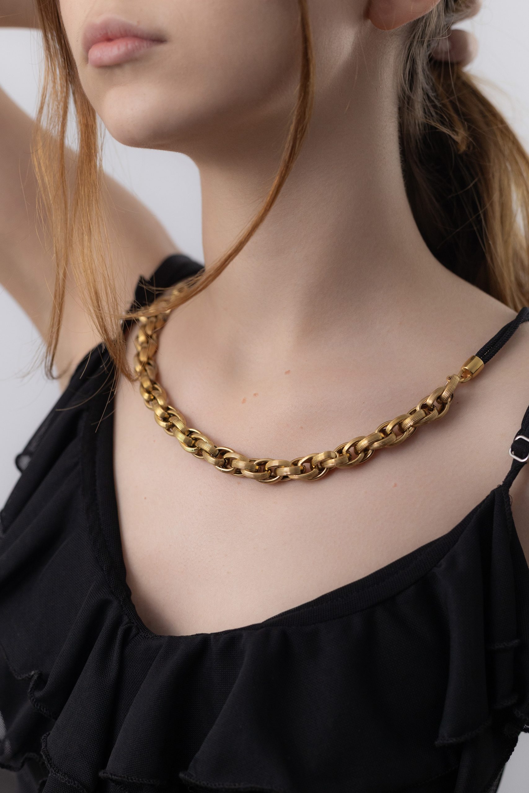 Colier pentru femei realizat dintr-o combinație de șnur și împletitură din lanț placat cu aur de 24k. Dispune de lanț prelungitor și un sistem de închidere tip homar. Lungimea colierului reglabilă intre 38 cm – 44 cm, extensia fiind de 6 cm. Acest colier este hipoalergenic. Piesele metalice sunt fabricate din ZAMAC (Zinc Aluminiu și Cupru) sau ALAMĂ (Fără nichel). Toate produsele noastre care intră în contact cu pielea sunt conforme cu Regulamentul european privind conținutul de nichel, cadmiu și plumb. Produs manual în Grecia! Referința: N5818G