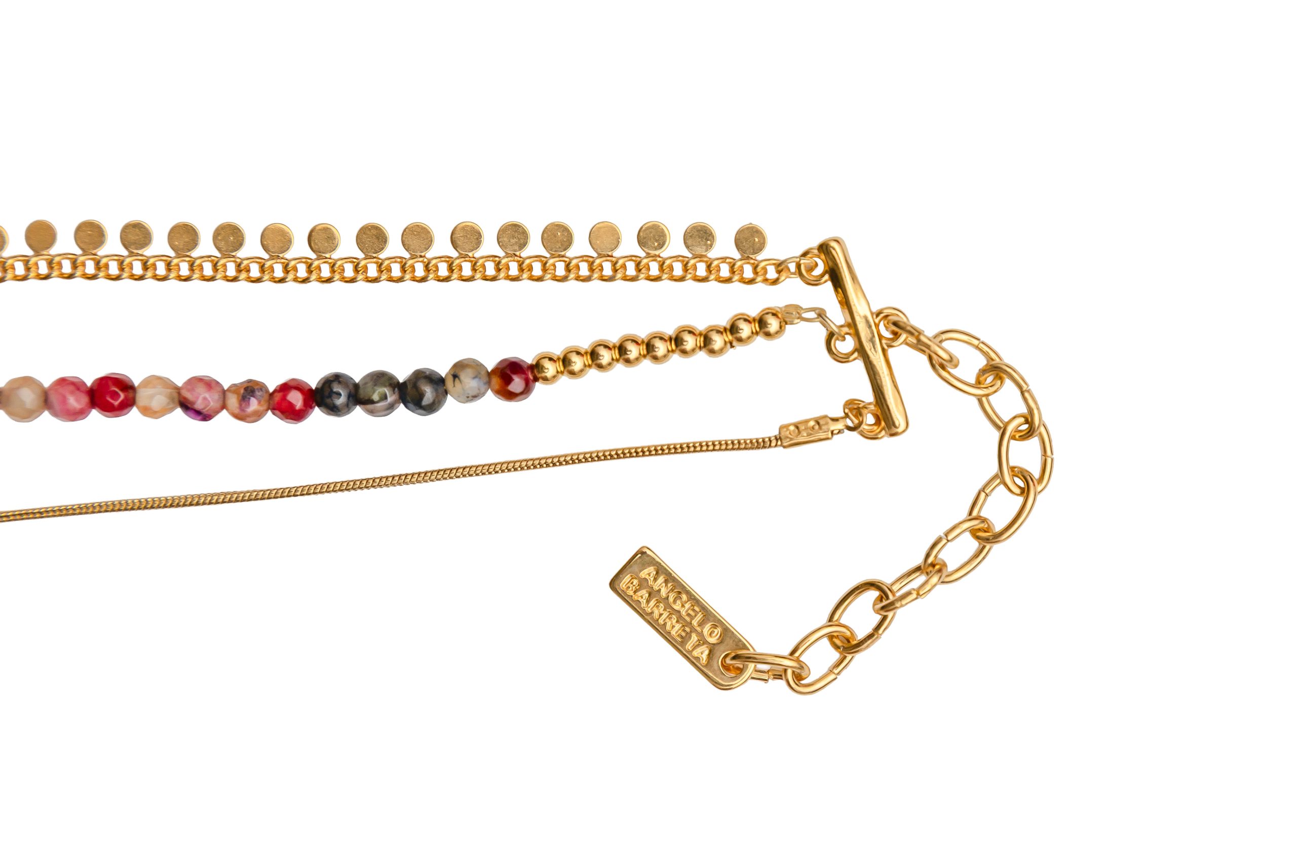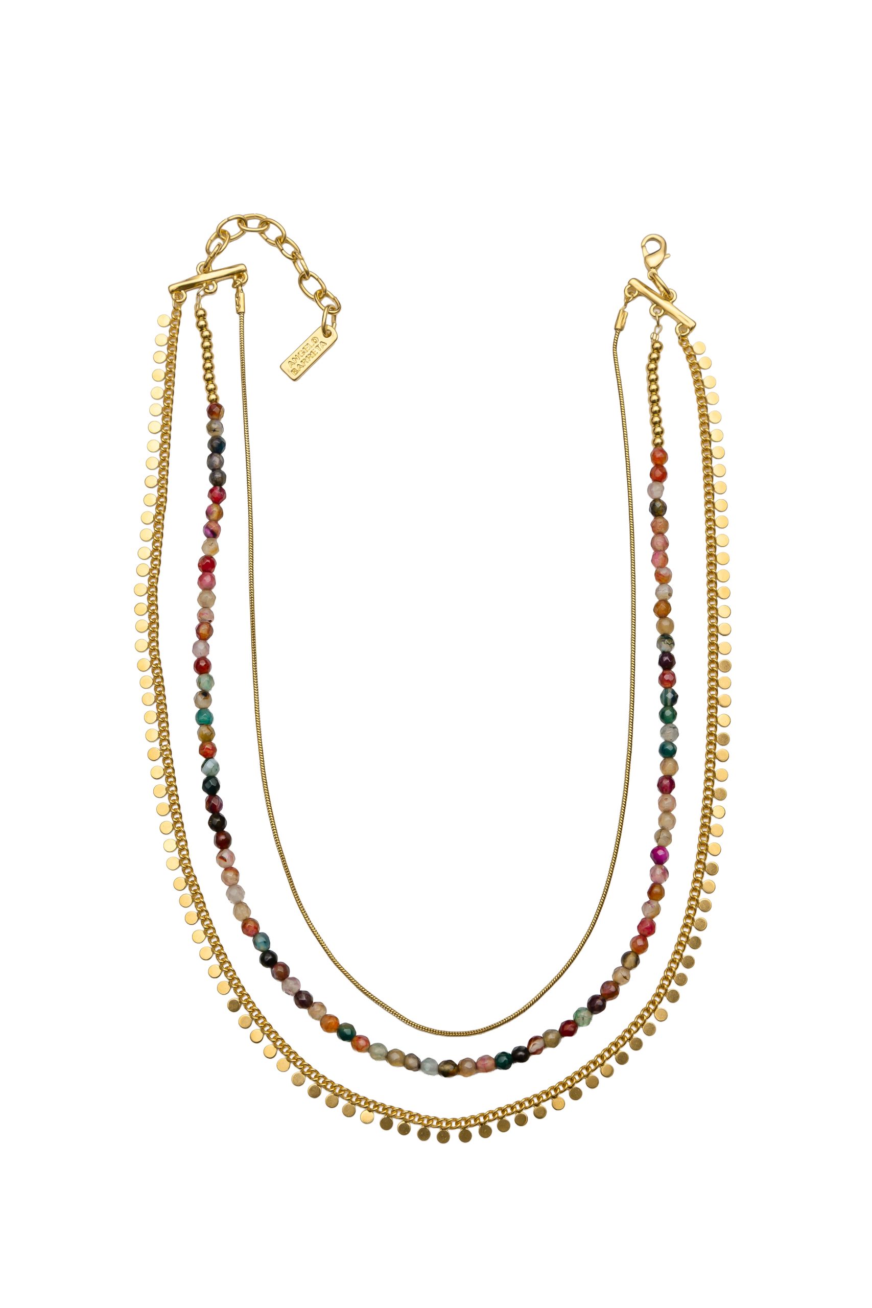 Colier triplu pentru femei realizat cu bănuți și lanț placați cu aur de 24k și decorat cu pietre semiprețioase de agat. Dispune de lanț prelungitor și un sistem de închidere tip homar. Lungimea colierului reglabilă intre 23 cm – 28 cm, extensia fiind de 5 cm. Acest colier este hipoalergenic. Piesele metalice sunt fabricate din ZAMAC (Zinc Aluminiu și Cupru) sau ALAMĂ (Fără nichel). Toate produsele noastre care intră în contact cu pielea sunt conforme cu Regulamentul european privind conținutul de nichel, cadmiu și plumb. Produs manual în Grecia! Referința: N6602G