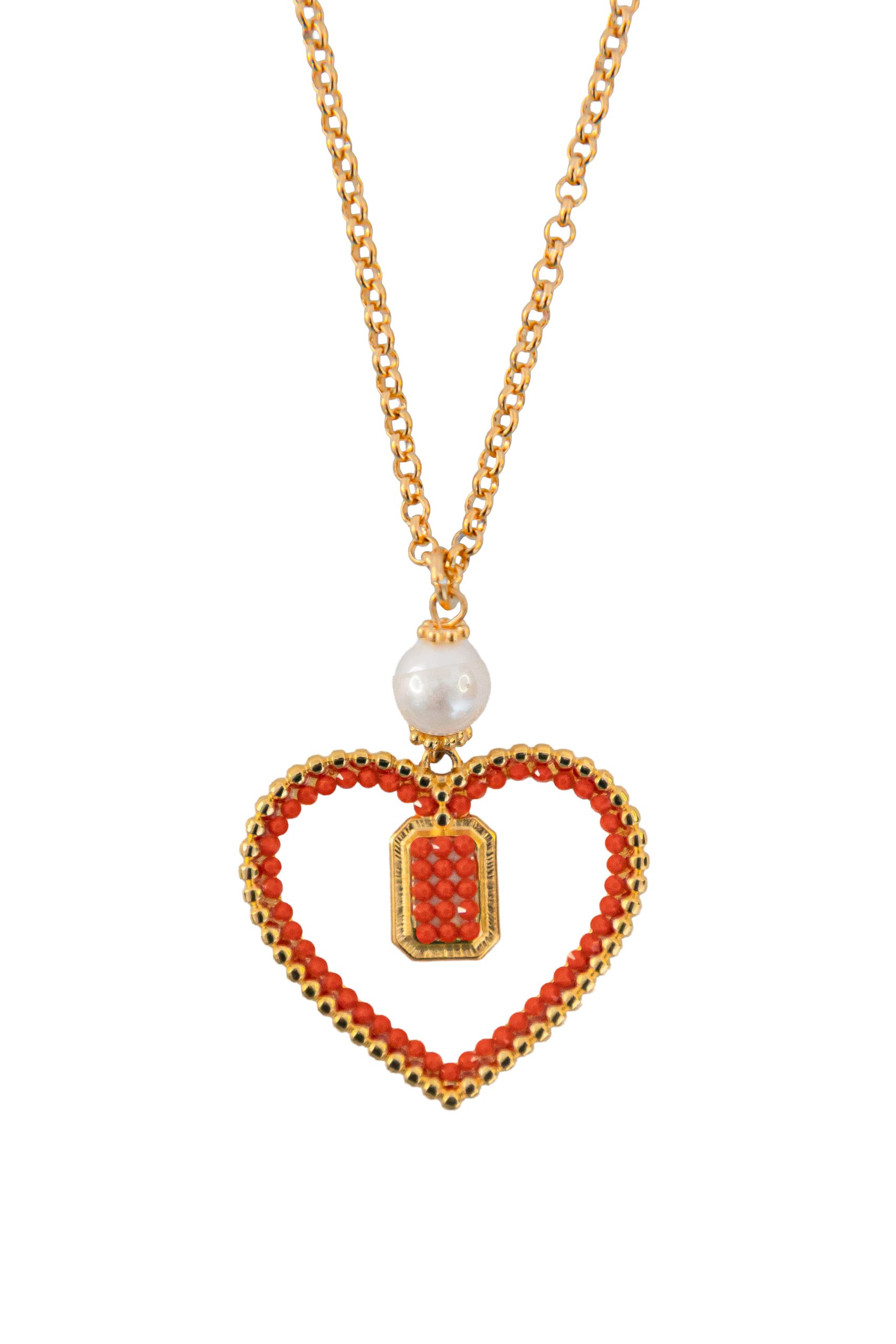 Colier pentru femei cu inimă cu cristale corai și perlă naturală de apă dulce