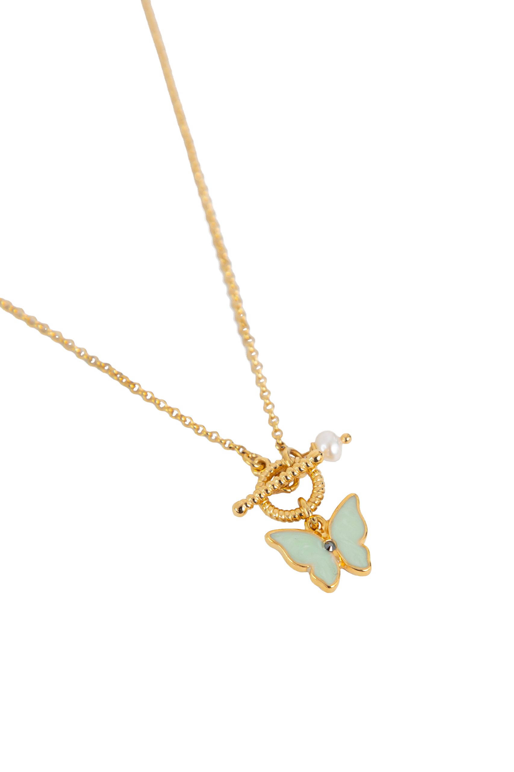 Colier pentru femei verde cu fluture din email și pandantiv cu perlă naturală de cultură