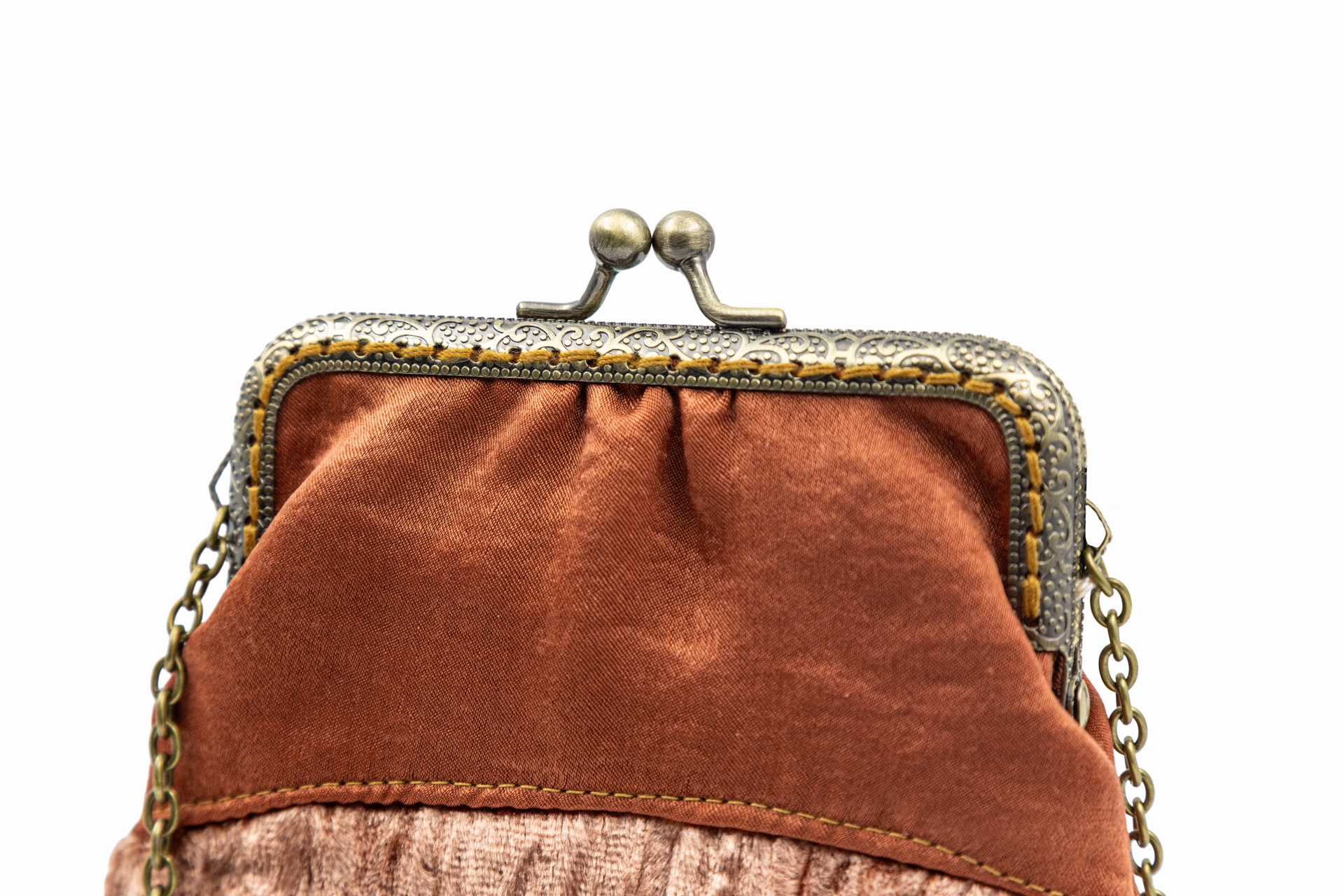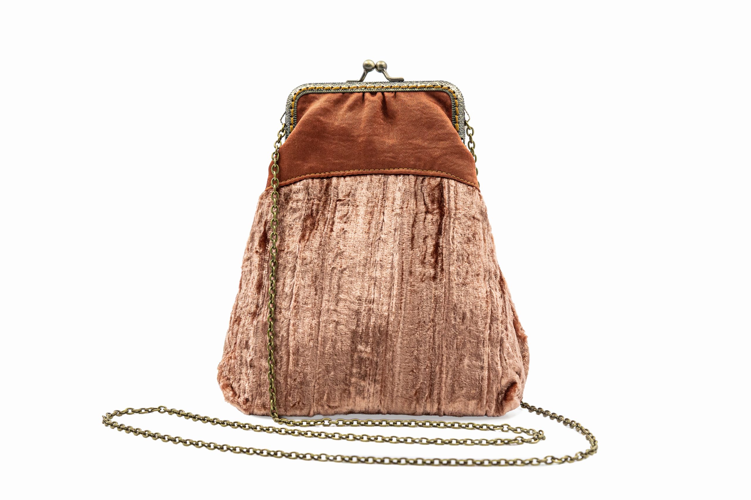 Poșetă Elegance medie, confecționată din catifea și poliester. Catifeaua naturală este o textură cu un aer regal, moale, strălucitoare și mată, o inserție de fire speciale de bumbac cu un aspect unic datorită proprietăților fibrelor sale scurte. Dispune de un lanț metalic subțire, reglabil, de 124 cm, poșeta putând fi purtată fie pe corp, fie pe umăr. Rama metalică este cusută manual, punct cu punct, și deține un sistem de închidere cu bile metalice. Dimensiunea poșetei este de 20 cm x 17 cm, iar deschiderea este de 10 cm. Produs original, în ediție limitată, fabricat manual în Grecia! Referința: EBM4AW24