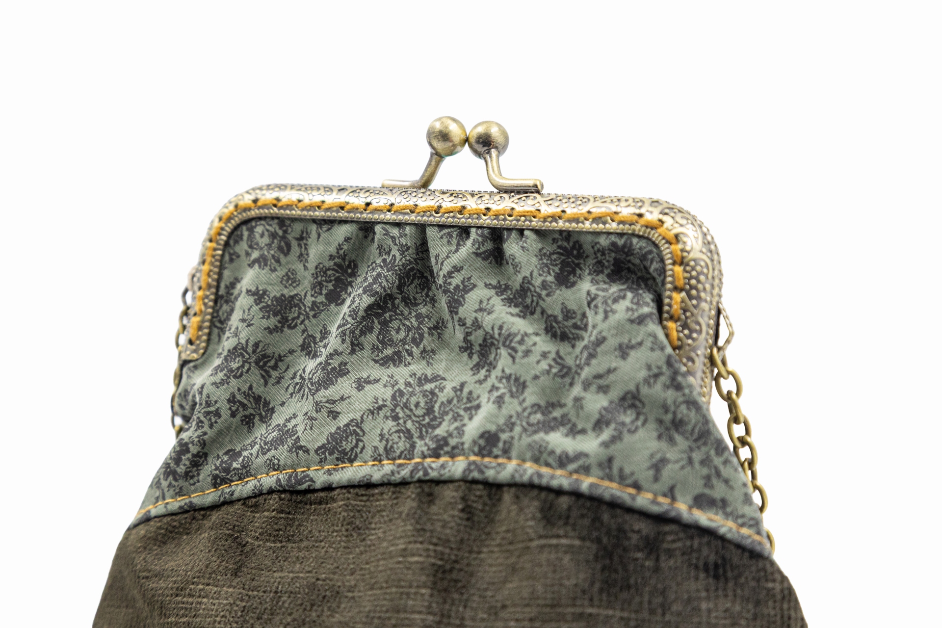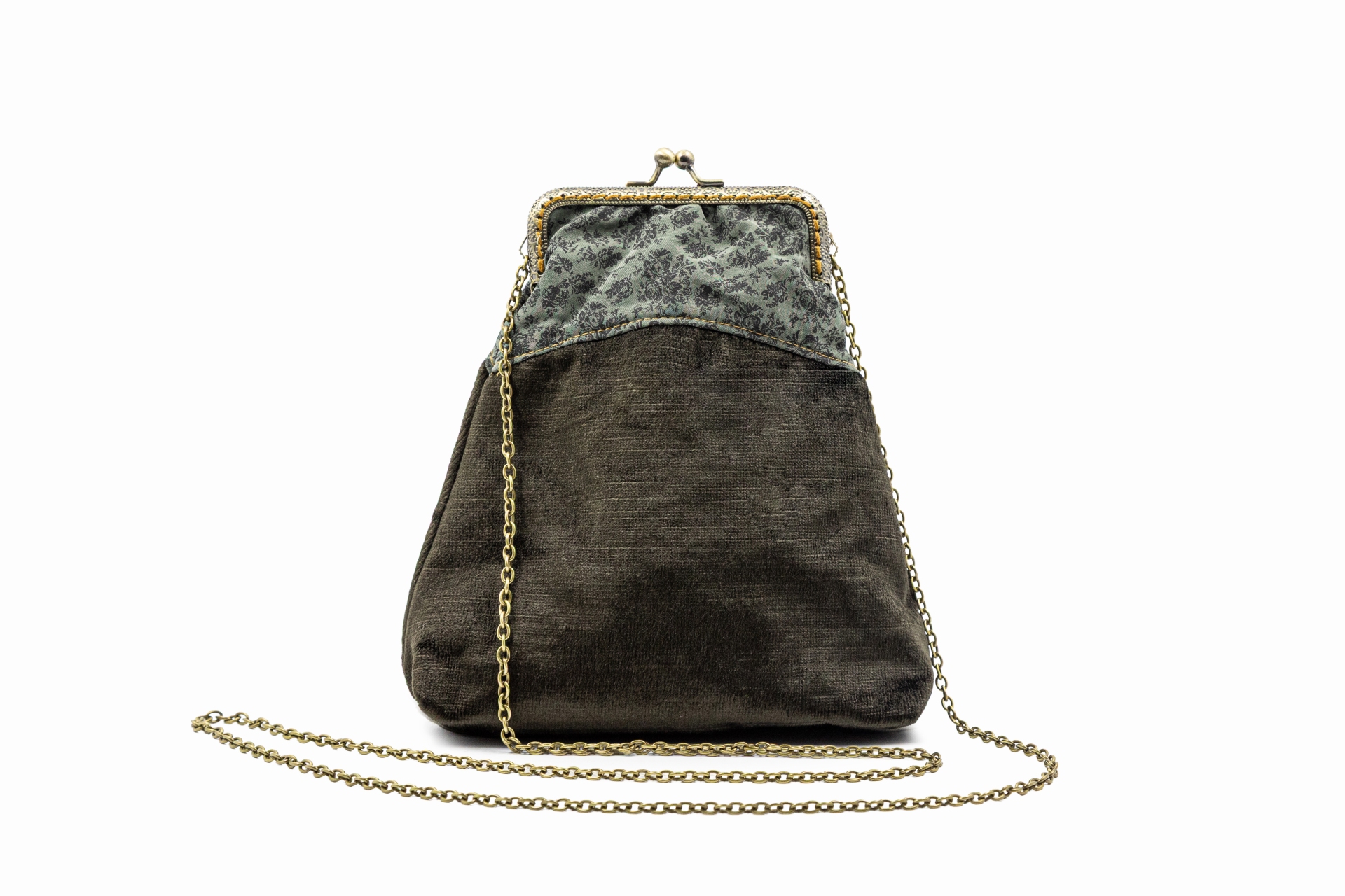 Poșetă Elegance medie, confecționată din catifea naturală și vâscoză imprimata manual* cu cerneluri ecologice, certificate, pe bază de apă*. Vâscoza este un material textil moale, neted și fluid, produs prin extragerea unor compuși naturali din lemn sau din pulpă de bumbac și care este utilizată ca înlocuitor al mătăsii. Dispune de un lanț metalic subțire, reglabil, de 124 cm, poșeta putând fi purtată fie pe corp, fie pe umăr. Rama metalică este cusută manual, punct cu punct, și deține un sistem de închidere cu bile metalice. Dimensiunea poșetei este de 20 cm x 17 cm, iar deschiderea este de 10 cm. Produs original, în ediție limitată, fabricat manual în Grecia! * Toate imprimeurile din țesături Dafne sunt proiectate și imprimate prin serigrafie manuală, cu cerneluri ecologice fără solvenți, certificate de către Soil Association Certification Ltd ca fiind organice și conform standardului ɶko-Tex 100 clasa 1. Referința: EBM1AW24