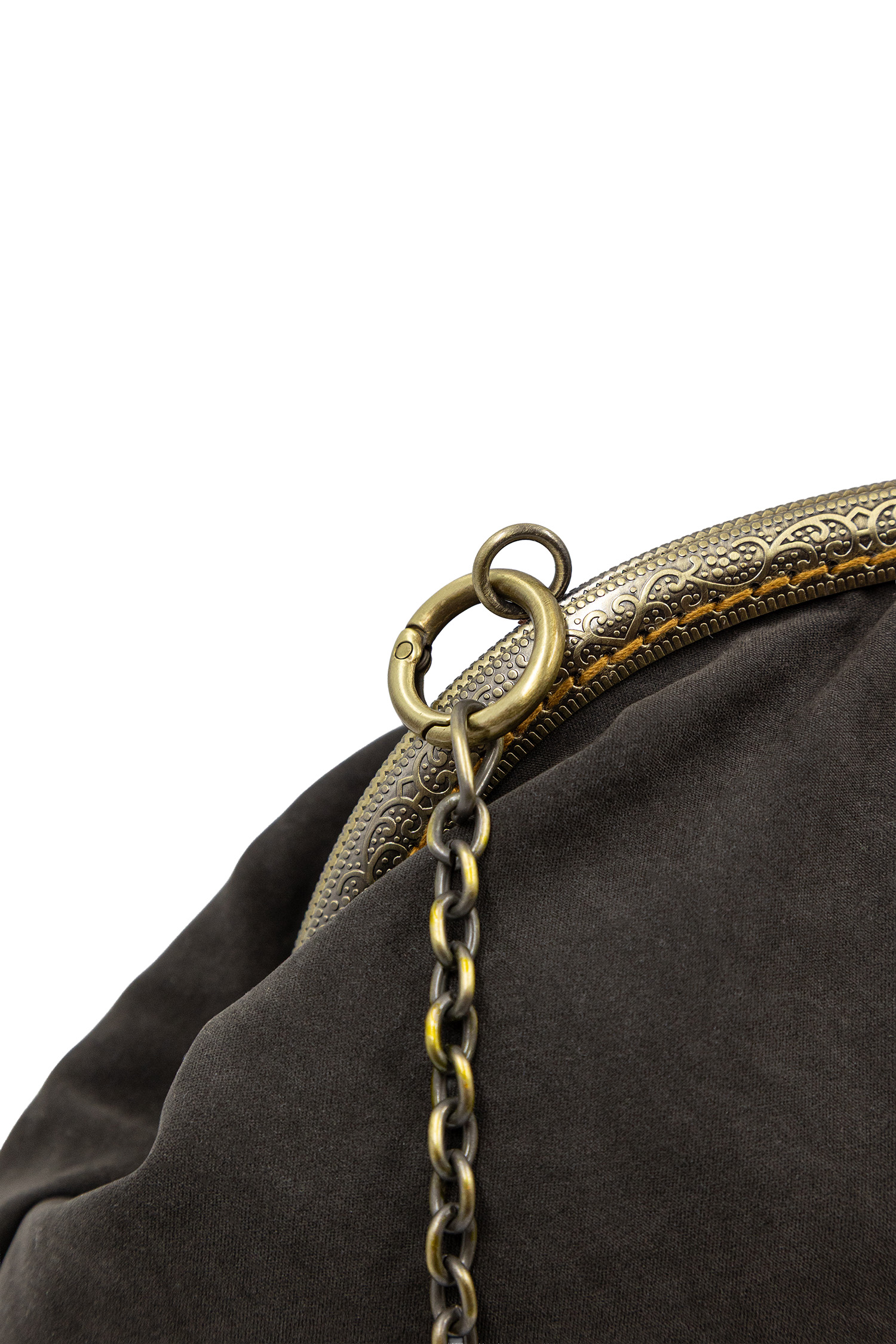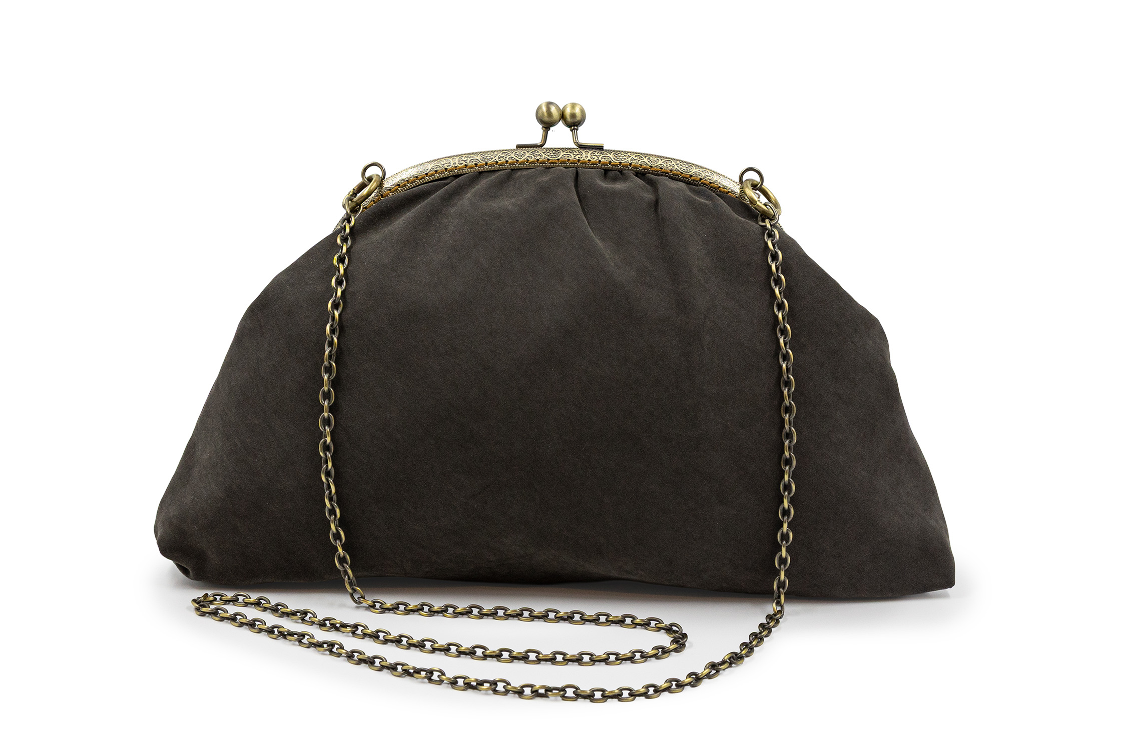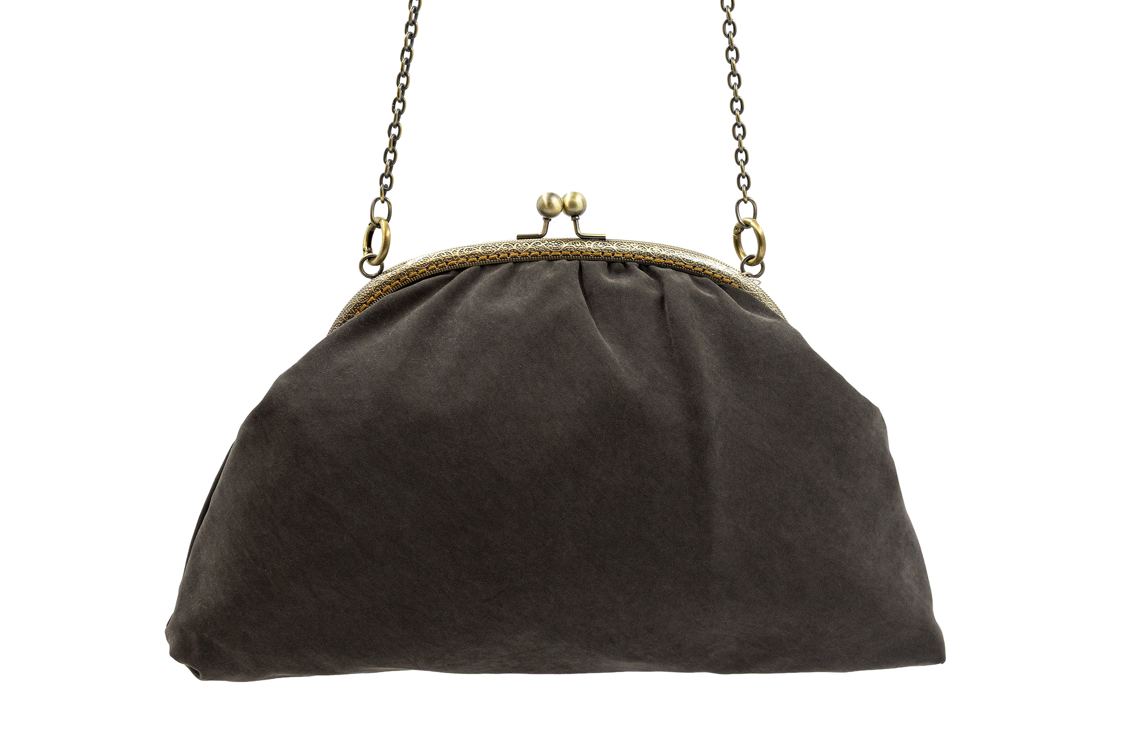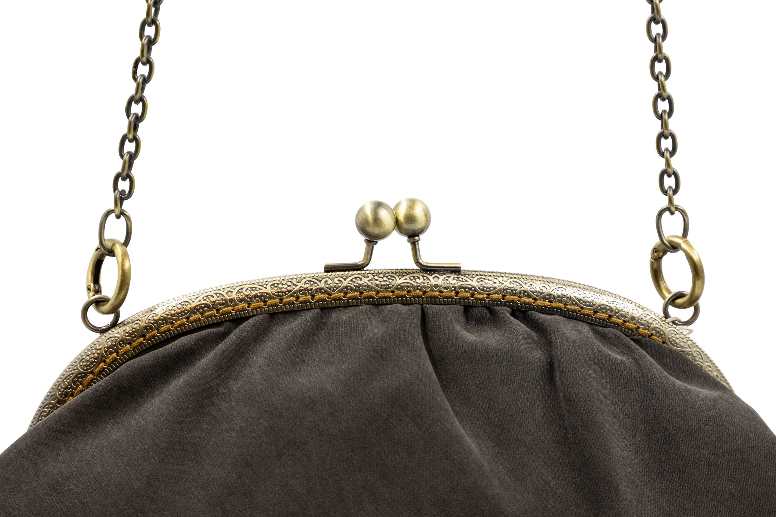 Poșetă Dafne reversibilă, confecționată din vâscoză. Vâscoza este un material textil moale, neted și fluid, produs prin extragerea unor compuși naturali din lemn sau din pulpă de bumbac și care este utilizată ca înlocuitor al mătăsii. Dispune de un lanț metalic reglabil și detașabil și poate fi purtată ca și clutch, îndepărtând lanțul de tot sau pe corp sau pe umăr, ajustând lungimea lanțului cu verigile de deschidere. Rama metalică este cusută manual, punct cu punct, și deține un sistem de închidere cu bile metalice. Dimensiunea poșetei este de 22 cm x 36 cm x 5 cm, iar deschiderea este de 25 cm. Produs original, în ediție limitată, fabricat manual în Grecia! Referința: DB1AW24