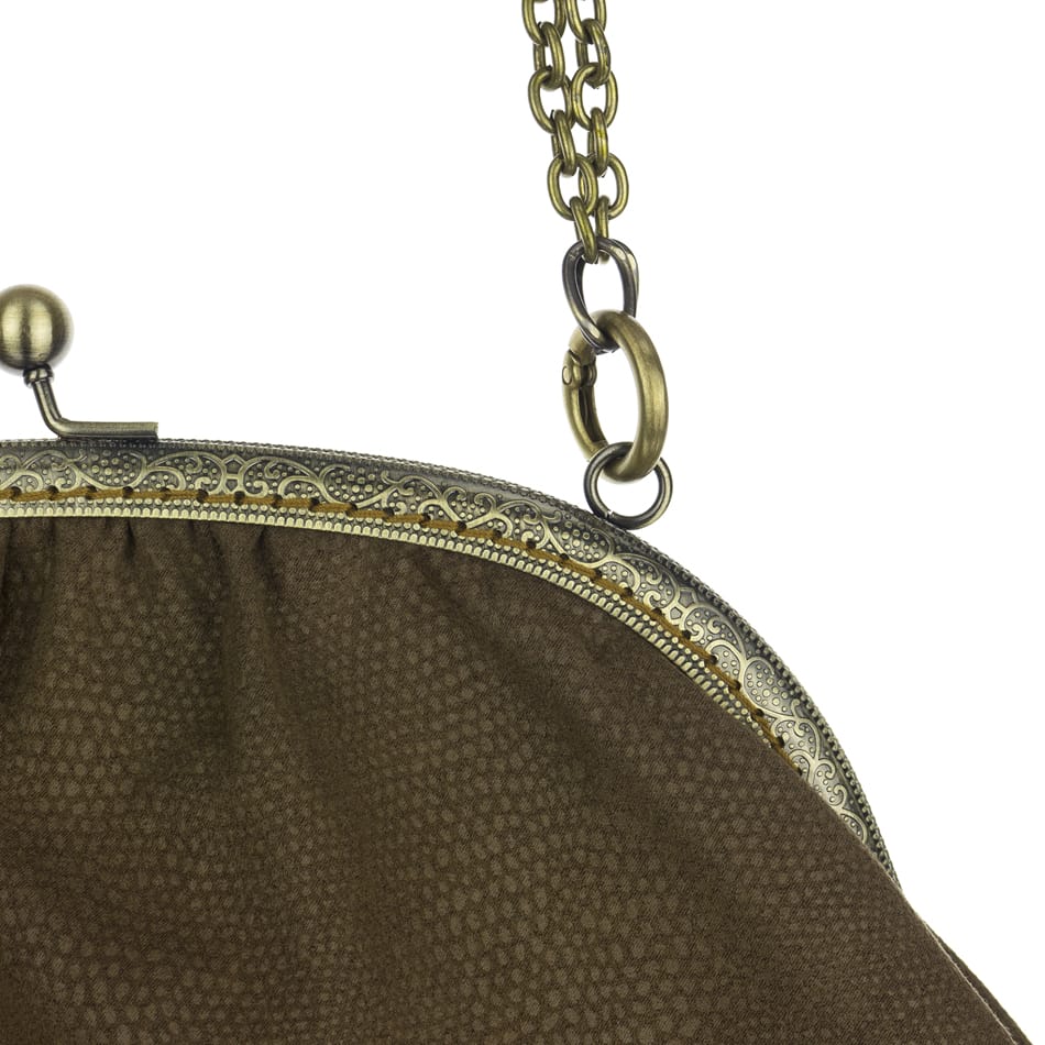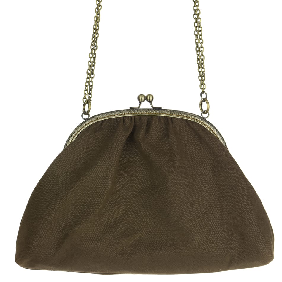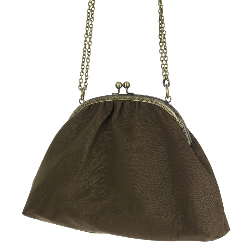 Poșetă Dafne reversibilă, confecționată din piele vegană ștanțată. Pielea vegană este considerată piele artificială sau imitație de piele din materiale cu proprietăți similare și un aspect comparabil cu pielea naturală, dar fără a fi fabricate din piele de animale,ea se caracterizează prin faptul că în adezivi, materiale de suport și altele asemenea nu se folosesc materiale de origine animală. Dispune de un lanț metalic reglabil și detașabil și poate fi purtată ca și clutch, îndepărtând lanțul de tot sau pe corp sau pe umăr, ajustând lungimea lanțului cu verigile de deschidere. Rama metalică este cusută manual, punct cu punct, și deține un sistem de închidere cu bile metalice. Dimensiunea poșetei este de 22 cm x 36 cm x 5 cm, iar deschiderea este de 25 cm. Produs original, în ediție limitată, fabricat manual în Grecia! Referința: DB2AW24