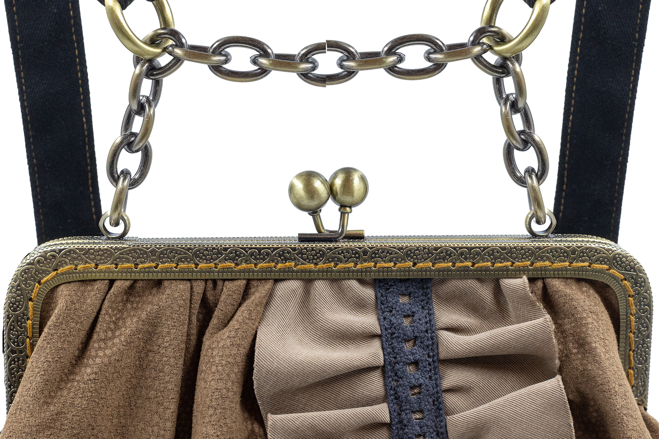 Rucsac unic confecționat din piele vegană și proiectat cu un volan bej din vâscoză și cu o inserție verticală subțire de dantelă din bumbac. Pielea vegană este considerată piele artificială sau imitație de piele din materiale cu proprietăți similare și un aspect comparabil cu pielea naturală, dar fără a fi fabricate din piele de animale,ea se caracterizează prin faptul că în adezivi, materiale de suport și altele asemenea nu se folosesc materiale de origine animală. Căptușeala interioară este echipată cu un buzunar de siguranță cu inchidere cu fermoar și un buzunar exterior pe partea din spate. Dispune de bretele reglabile din bumbac, curelele, pe lângă lungime, fiind reglate cu inele care se deschid și care pot fi conectate la mânerul tip lanț, ajustând sau scoțând lanțul cu veriga de deschidere. Rama metalică este cusută manual, punct cu punct, și deține un sistem de închidere cu bile metalice. Dimensiunea rucsacului este de 35 cm x 28 cm. Produs original, în ediție limitată, fabricat manual în Grecia! Referința: LBP5cAW24